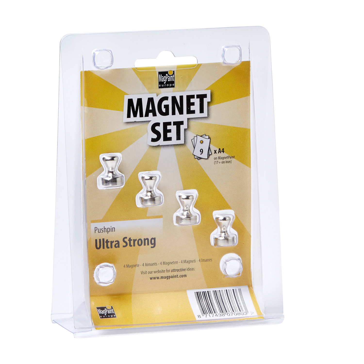 Ergänzung zu Ihrer Magnetwand extra stark 4 Stück bis zu 9 DIN A4 Blätter Produktinformation Das MagPaint Magnetset Pushpin Ultra Strong ist die perfekte Ergänzung zu Ihrer...