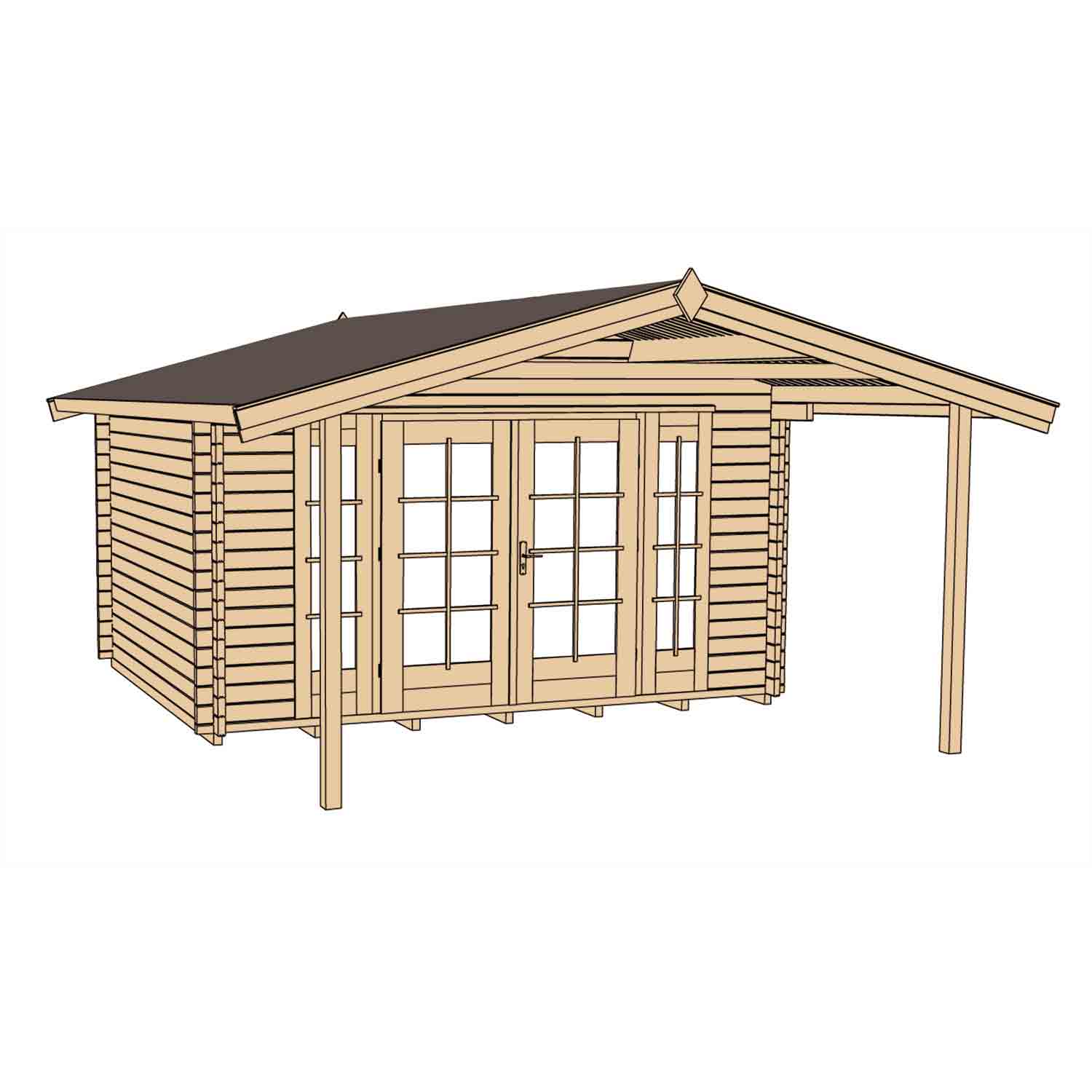 Die Doppeltür und 2 Einzelfenster bringen Licht ins Innere und sorgen für ein angenehmes Wohlempfinden. Das Gartenhaus eignet sich ebenfalls als Geräteschuppen und bietet genug Platz für Kaminholz, Gartenmöbel oder Gartengeräte.