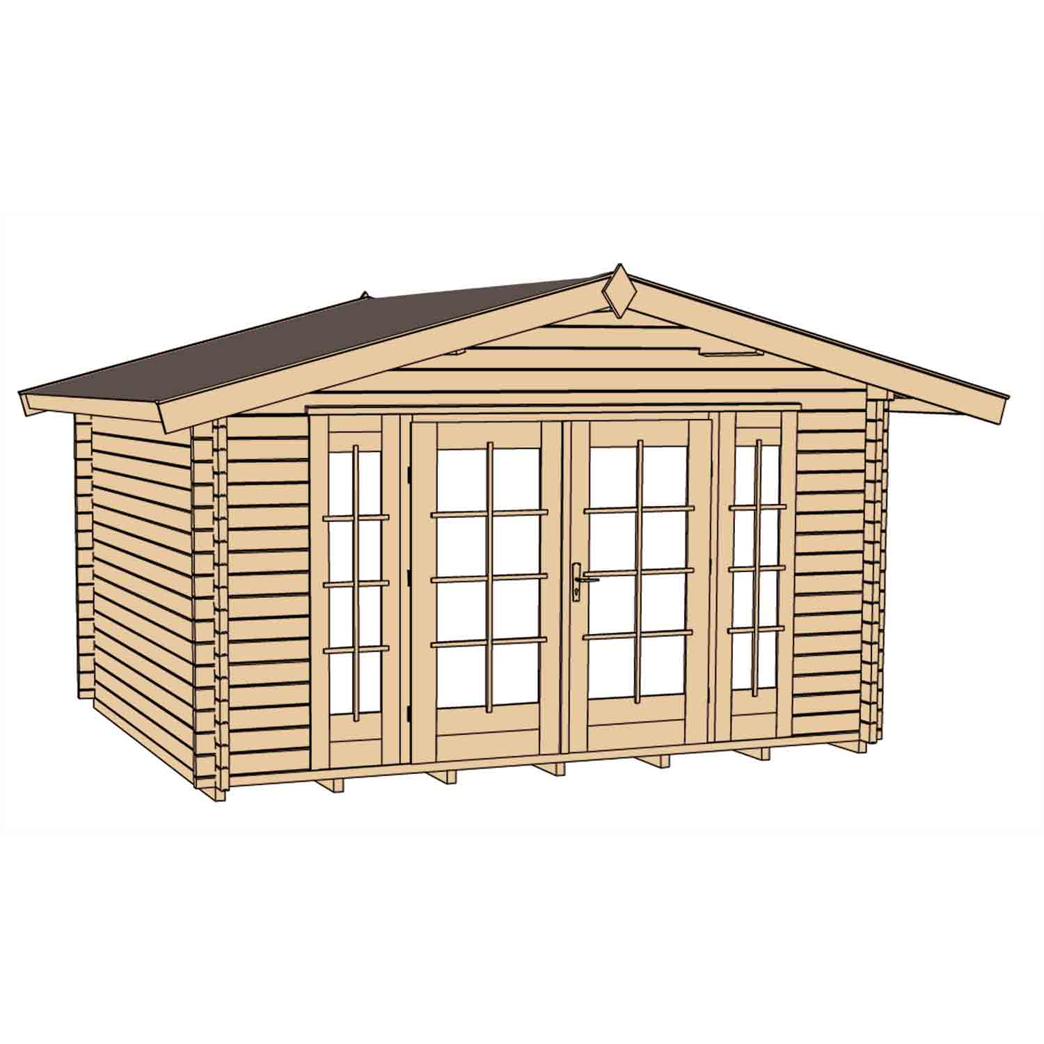 Wandstärke: 45 mm Material: europäische Fichte Dachform: Satteldach Dachstärke: 19 mm inkl. 19 mm starken Massivholzboden inkl. Doppeltür und zwei große, feststehende Fenster mit...