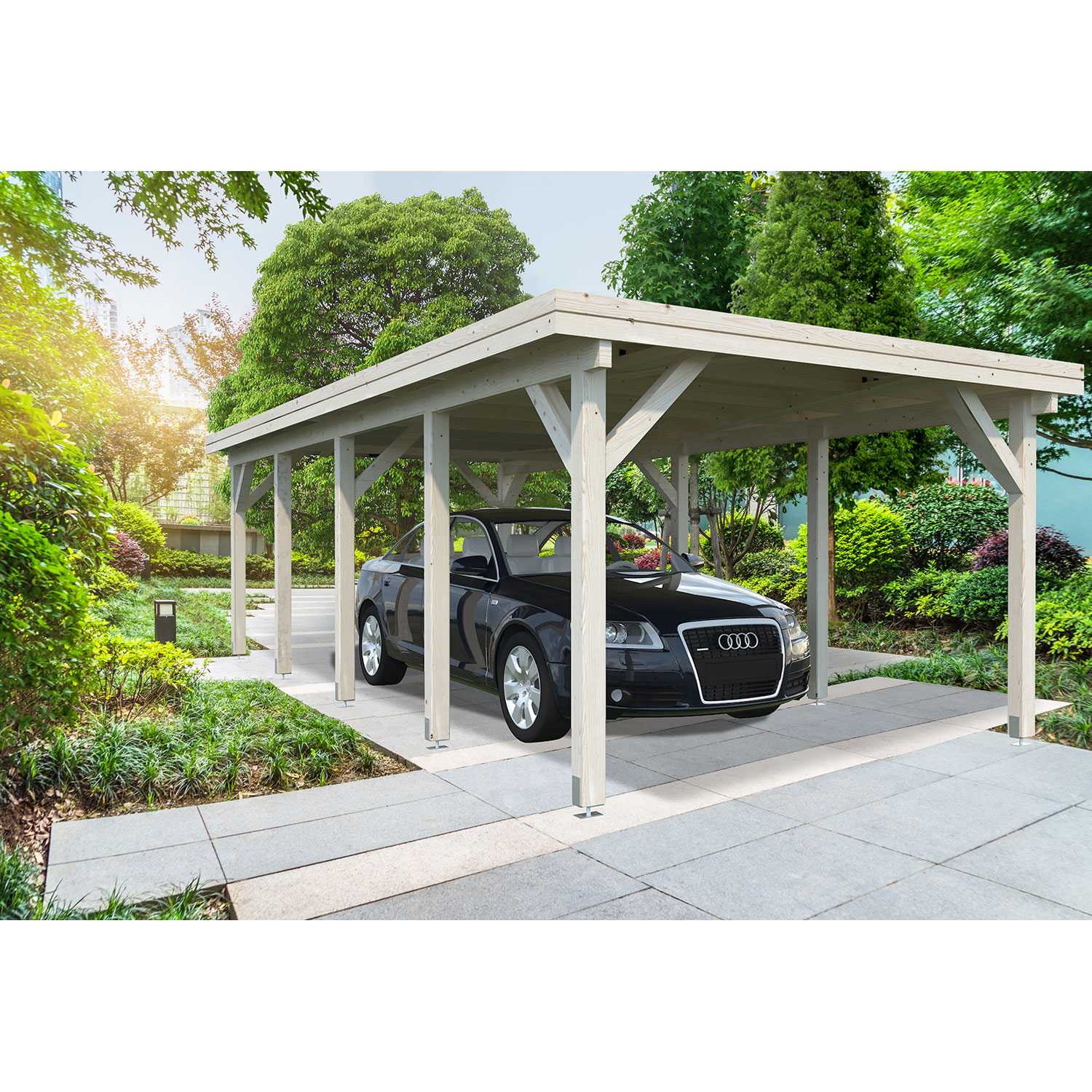 Das Palmako Carport Karl hat eine Grundfläche von 23,1 m² und ist die ideale Möglichkeit Ihr Fahrzeug vor beispielsweise Hagel und Schnee zu schützen. Auch im Sommer steigen Sie in ein Fahrzeug mit angenehmer Temperatur ein. Das nordische Fichtenholz ist transparent tauchgrundiert und durch die Herstellung aus robustem Massivholz besonders langlebig und beständig.