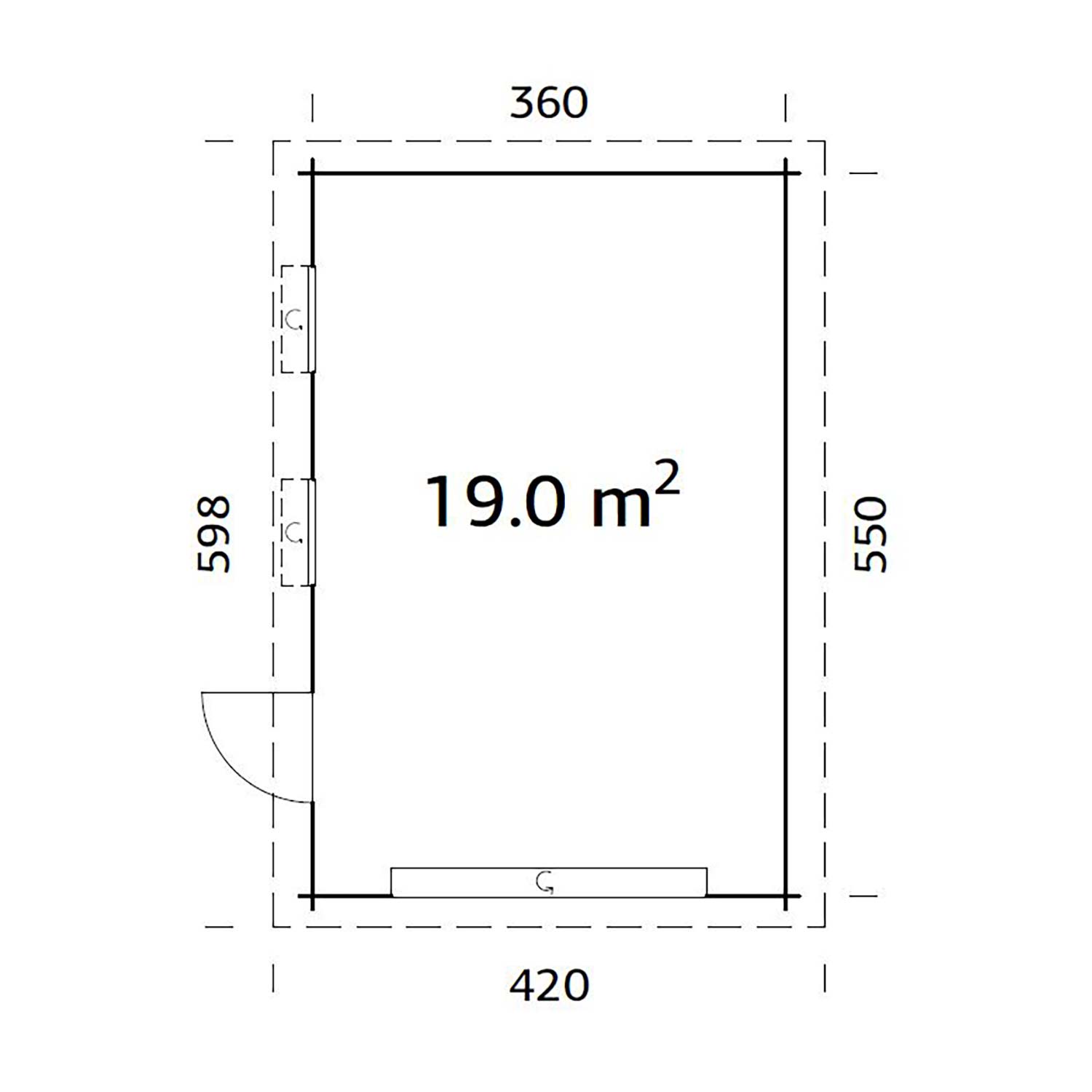 Wandstärke: 44 mm Material: nordisches Fichtenholz Dachform: Flachdach Farbbehandlung / Farbe: naturbelassen Grundfläche: 19,0 m² Umbauter Raum: 44,5 m³ Tür: Doppeltür Tür /...