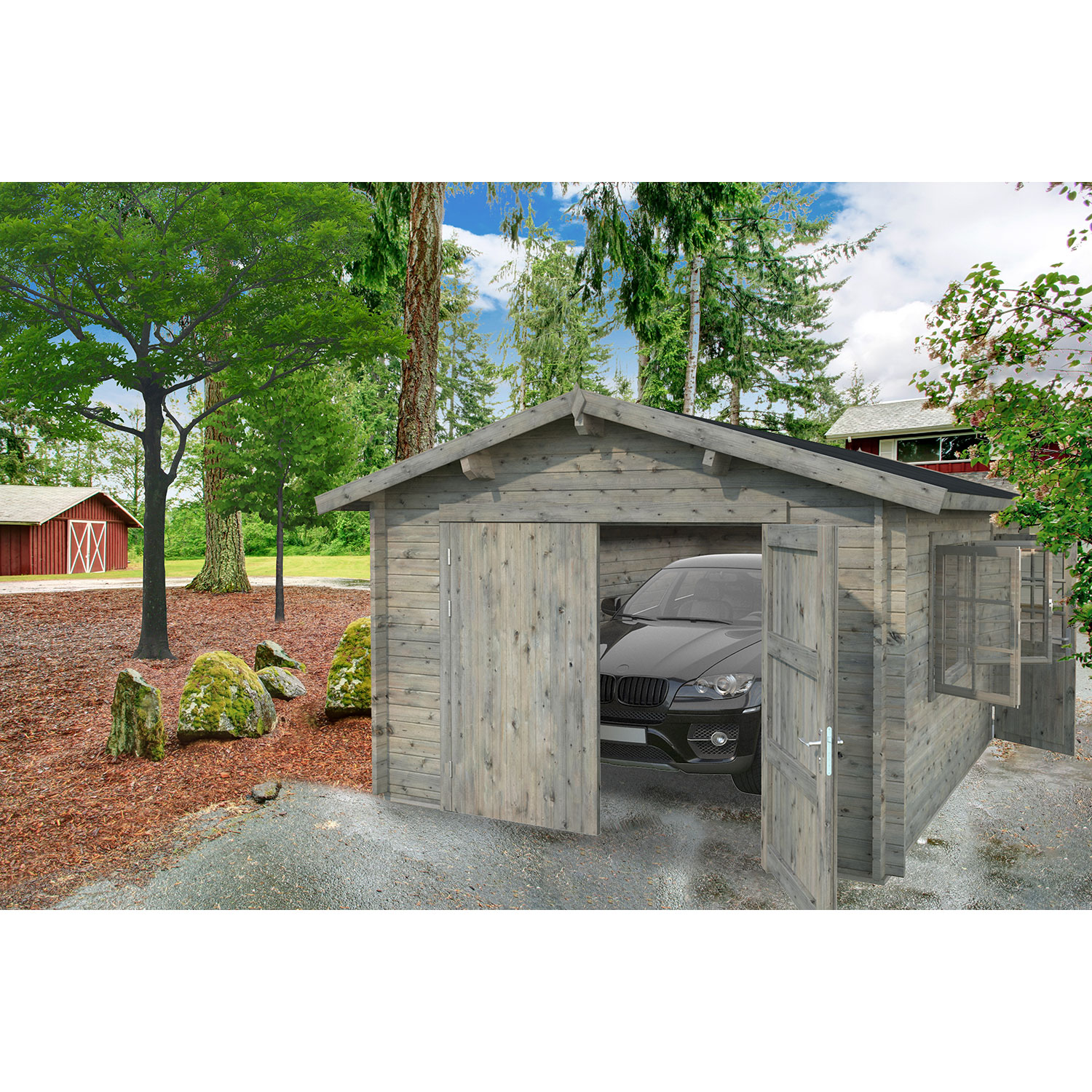 Die Palmako Garage Roger mit Holztor hat eine Grundfläche von 19,0 m² und eine Wandstärke von 44 mm. Die Garagenmodelle von Palmako sind aus nordischer Fichte gefertigt. Das schöne Design passt sich an jedes Grundstück perfekt an. Neben der Möglichkeit Ihr Fahrzeug unterzustellen kann es auch als Gerätehaus dienen. Das nordische Fichtenholz ist grau tauchgrundiert und durch die Herstellung aus robustem Massivholz besonders langlebig und beständig.