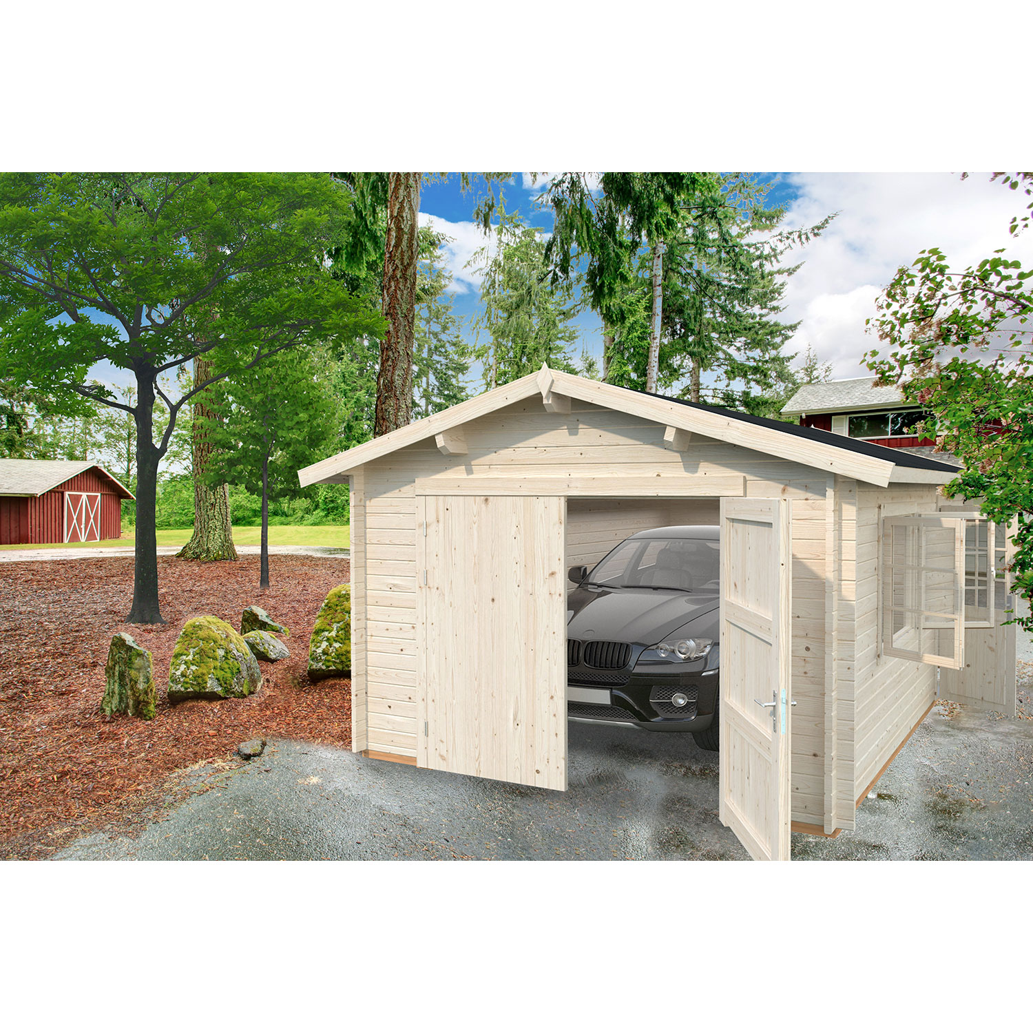 Die Palmako Garage Roger mit Holztor hat eine Grundfläche von 19,0 m² und eine Wandstärke von 44 mm. Die Garagenmodelle von Palmako sind aus nordischer Fichte gefertigt. Das schöne Design passt sich an jedes Grundstück perfekt an. Neben der Möglichkeit Ihr Fahrzeug unterzustellen kann es auch als Gerätehaus dienen. Das nordische Fichtenholz ist transparent tauchgrundiert und durch die Herstellung aus robustem Massivholz besonders langlebig und beständig.