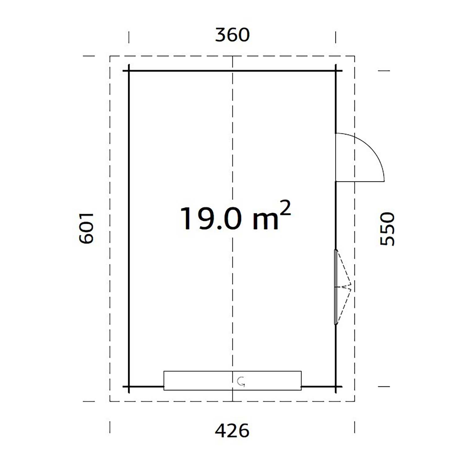 Wandstärke: 44 mm Material: nordisches Fichtenholz Dachform: Satteldach Farbbehandlung / Farbe: transparent tauchgrundiert Grundfläche: 19,0 m² Umbauter Raum: 45,9 m³ Tür:...