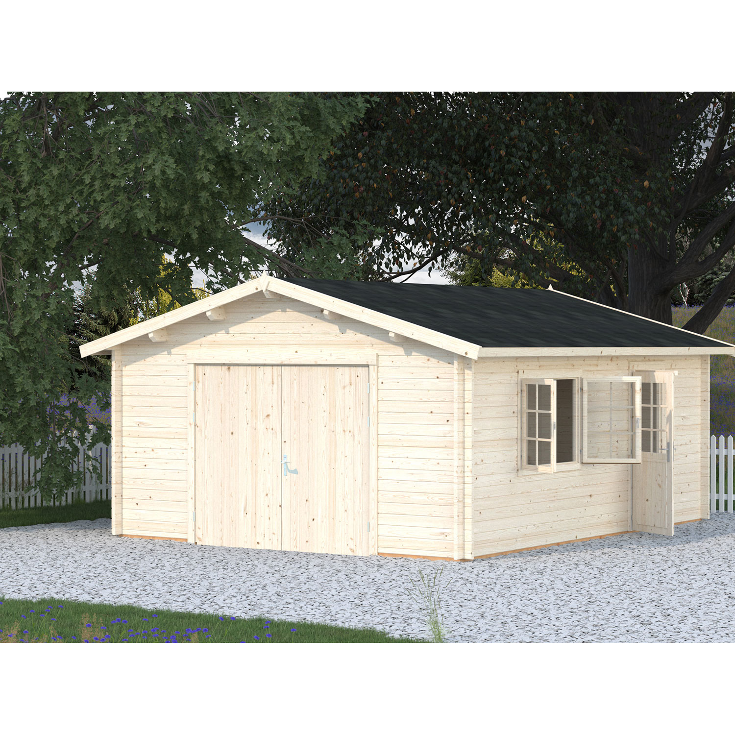 Die Palmako Garage Roger mit Holztor hat eine Grundfläche von 23,9 m² und eine Wandstärke von 44 mm. Die Garagenmodelle von Palmako sind aus nordischer Fichte gefertigt. Das schöne Design passt sich an jedes Grundstück perfekt an. Neben der Möglichkeit Ihr Fahrzeug unterzustellen kann es auch als Gerätehaus dienen. Das nordische Fichtenholz ist naturbelassen und durch die Herstellung aus robustem Massivholz besonders langlebig und beständig.