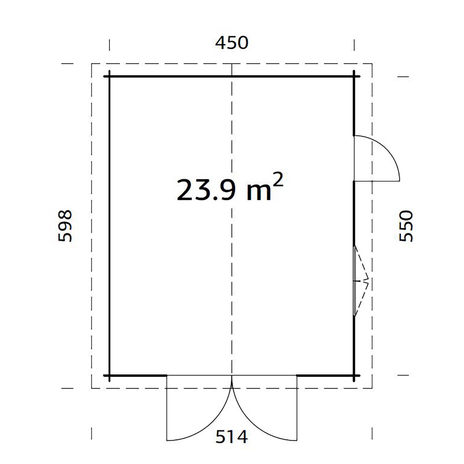 Wandstärke: 44 mm Material: nordisches Fichtenholz Dachform: Satteldach Farbbehandlung / Farbe: grau tauchgrundiert Grundfläche: 23,9 m² Umbauter Raum: 59 m³ Tür: Doppeltür Tür /...