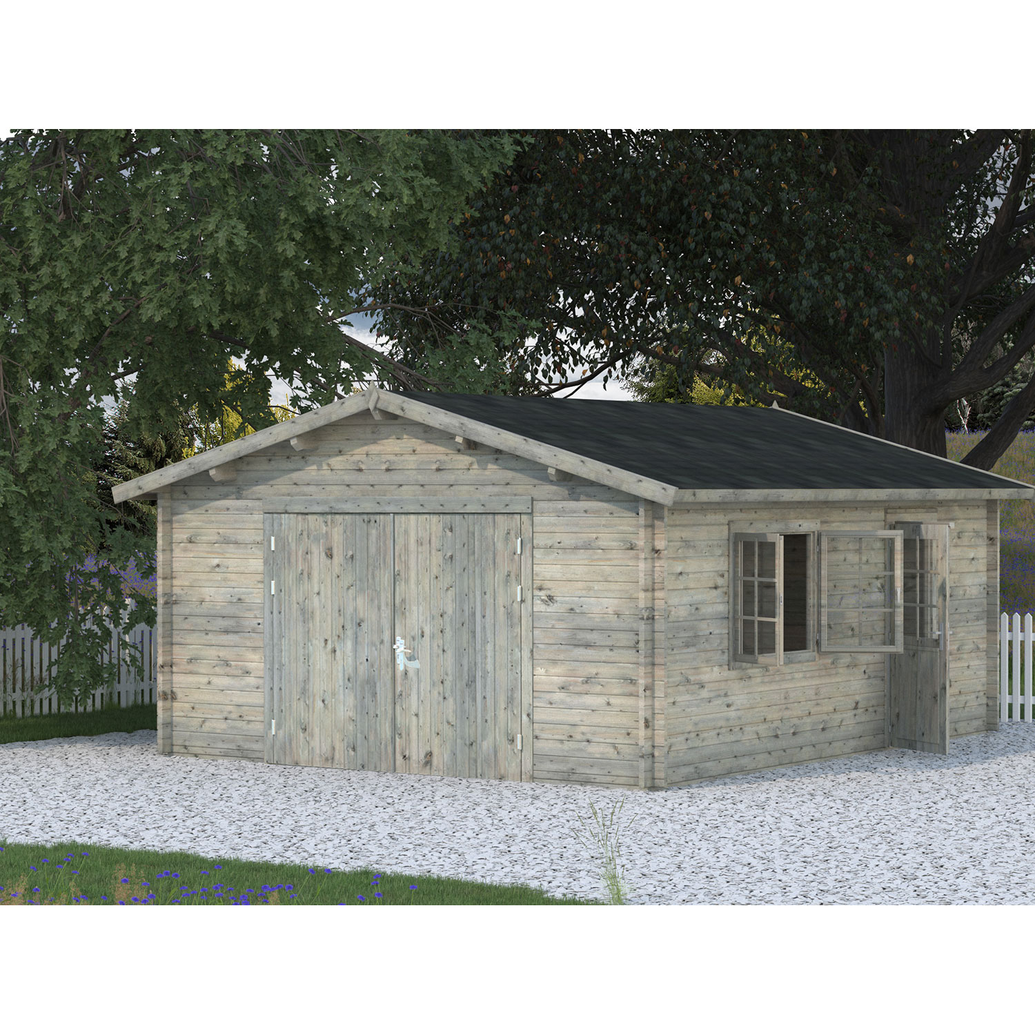 Die Palmako Garage Roger mit Holztor hat eine Grundfläche von 23,9 m² und eine Wandstärke von 44 mm. Die Garagenmodelle von Palmako sind aus nordischer Fichte gefertigt. Das schöne Design passt sich an jedes Grundstück perfekt an. Neben der Möglichkeit Ihr Fahrzeug unterzustellen kann es auch als Gerätehaus dienen. Das nordische Fichtenholz ist grau tauchgrundiert und durch die Herstellung aus robustem Massivholz besonders langlebig und beständig.
