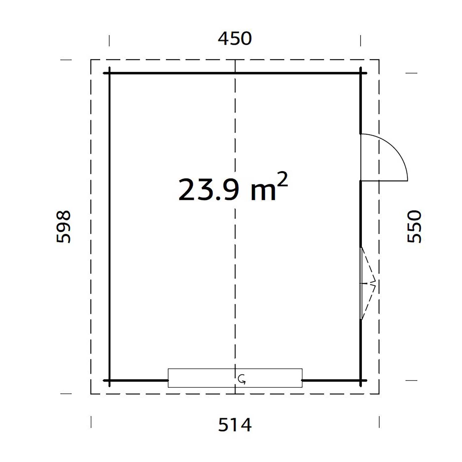 Wandstärke: 44 mm Material: nordisches Fichtenholz Dachform: Satteldach Farbbehandlung / Farbe: transparent tauchgrundiert Grundfläche: 23,9 m² Umbauter Raum: 59 m³ Tür: Doppeltür...