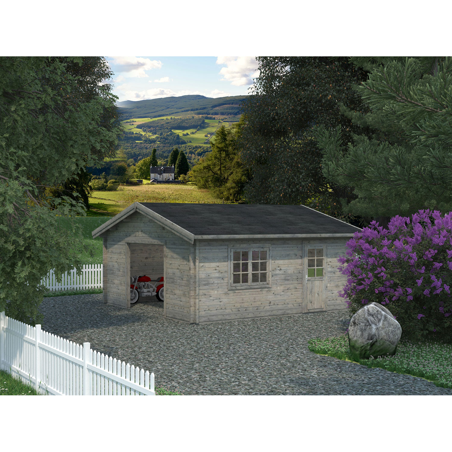 Die Palmako Garage Roger ohne Tor hat eine Grundfläche von 27,7 m² und eine Wandstärke von 70 mm. Die Garagenmodelle von Palmako sind aus nordischer Fichte gefertigt. Das schöne Design passt sich an jedes Grundstück perfekt an. Neben der Möglichkeit Ihr Fahrzeug unterzustellen kann es auch als Gerätehaus dienen. Das nordische Fichtenholz ist grau tauchgrundiert und durch die Herstellung aus robustem Massivholz besonders langlebig und beständig.