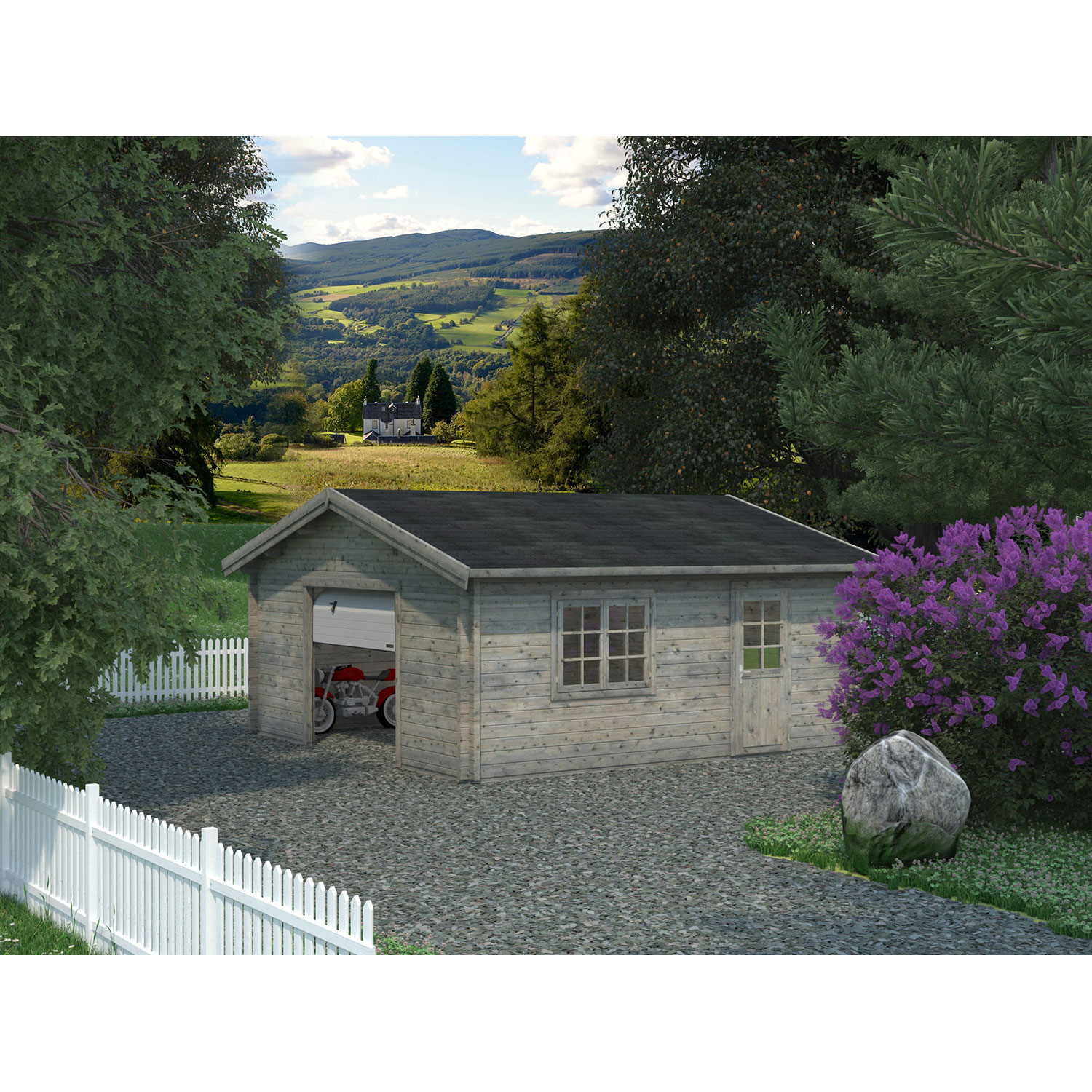 Die Palmako Garage Roger mit Sektionaltor hat eine Grundfläche von 27,7 m² und eine Wandstärke von 70 mm. Die Garagenmodelle von Palmako sind aus nordischer Fichte gefertigt. Das schöne Design passt sich an jedes Grundstück perfekt an. Neben der Möglichkeit Ihr Fahrzeug unterzustellen kann es auch als Gerätehaus dienen. Das nordische Fichtenholz ist grau tauchgrundiert und durch die Herstellung aus robustem Massivholz besonders langlebig und beständig.