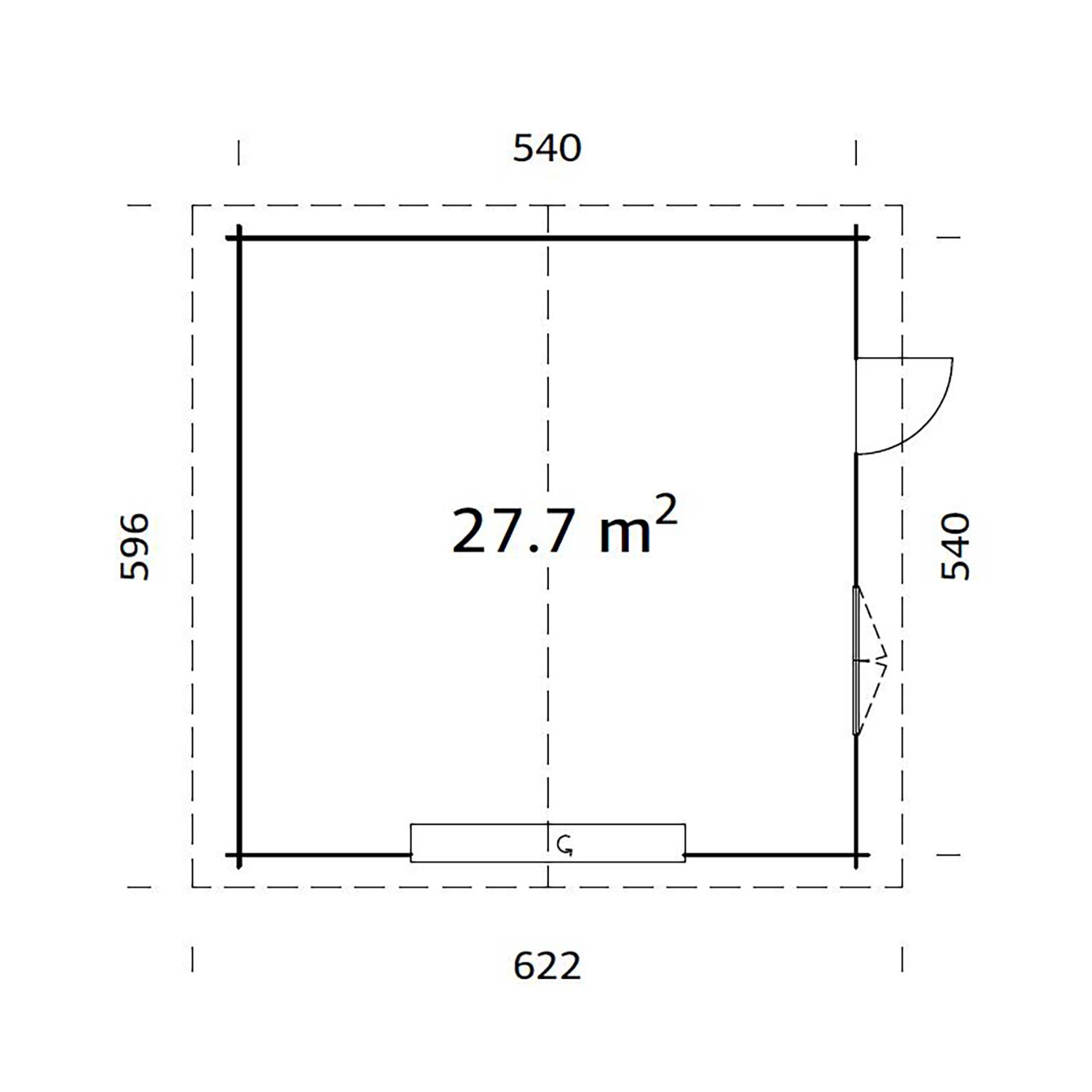 Wandstärke: 70 mm Material: nordisches Fichtenholz Dachform: Satteldach Farbbehandlung / Farbe: grau tauchgrundiert Grundfläche: 27,7 m² Umbauter Raum: 73,9 m³ Tür: Doppeltür Tür...