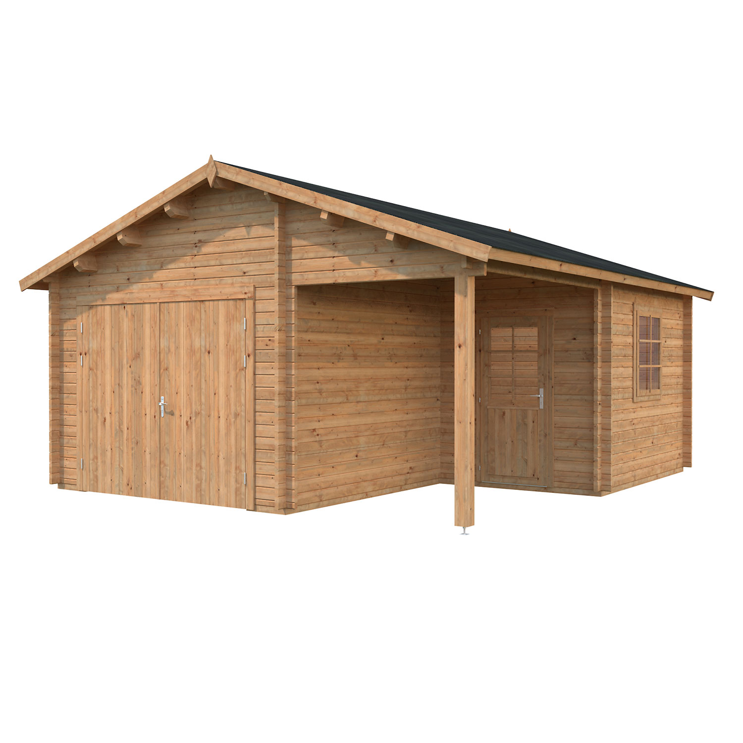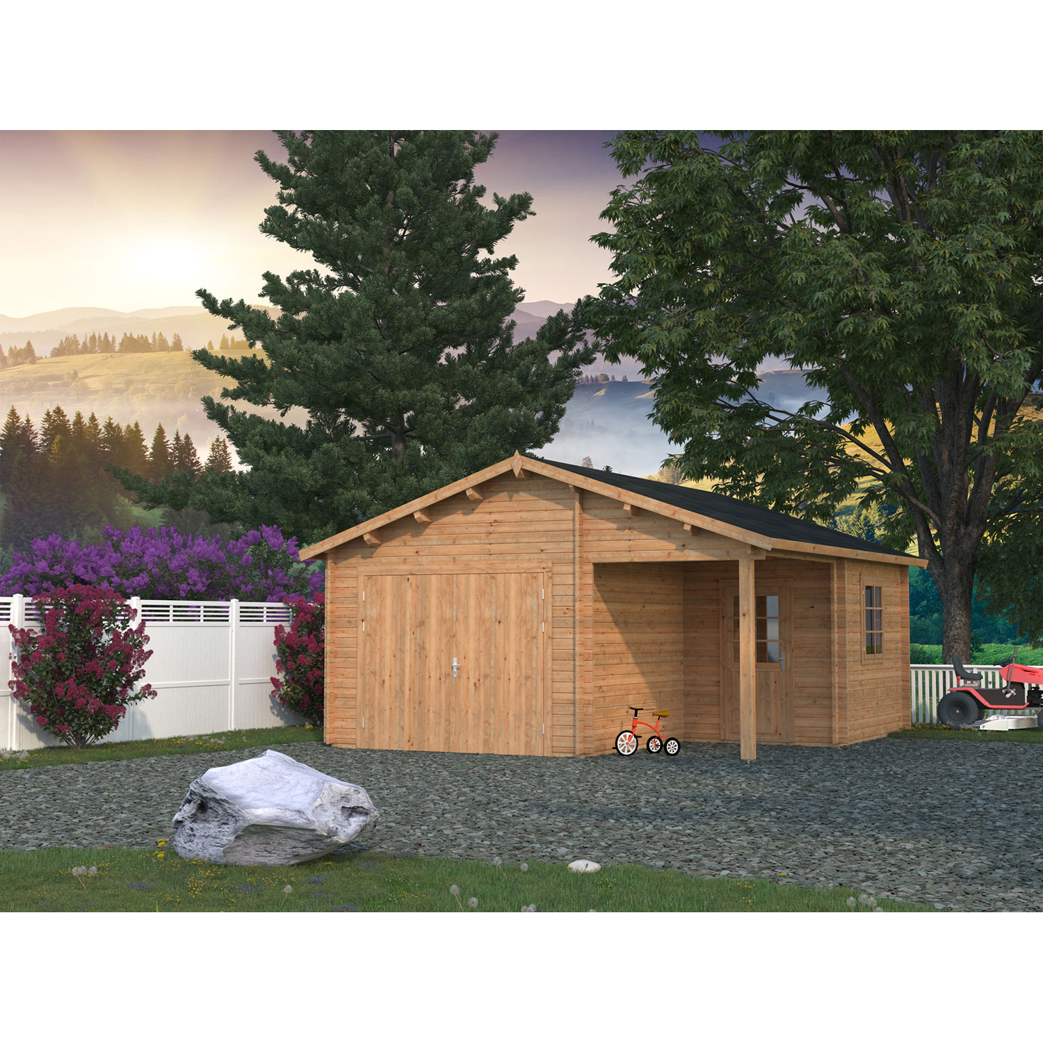 Die Palmako Garage Roger mit Holztor hat eine Grundfläche von 21,9+5,2 m² und eine Wandstärke von 44 mm. Die Garagenmodelle von Palmako sind aus nordischer Fichte gefertigt. Das schöne Design passt sich an jedes Grundstück perfekt an. Neben der Möglichkeit Ihr Fahrzeug unterzustellen kann es auch als Gerätehaus dienen. Das nordische Fichtenholz ist hellbraun tauchgrundiert und durch die Herstellung aus robustem Massivholz besonders langlebig und beständig.