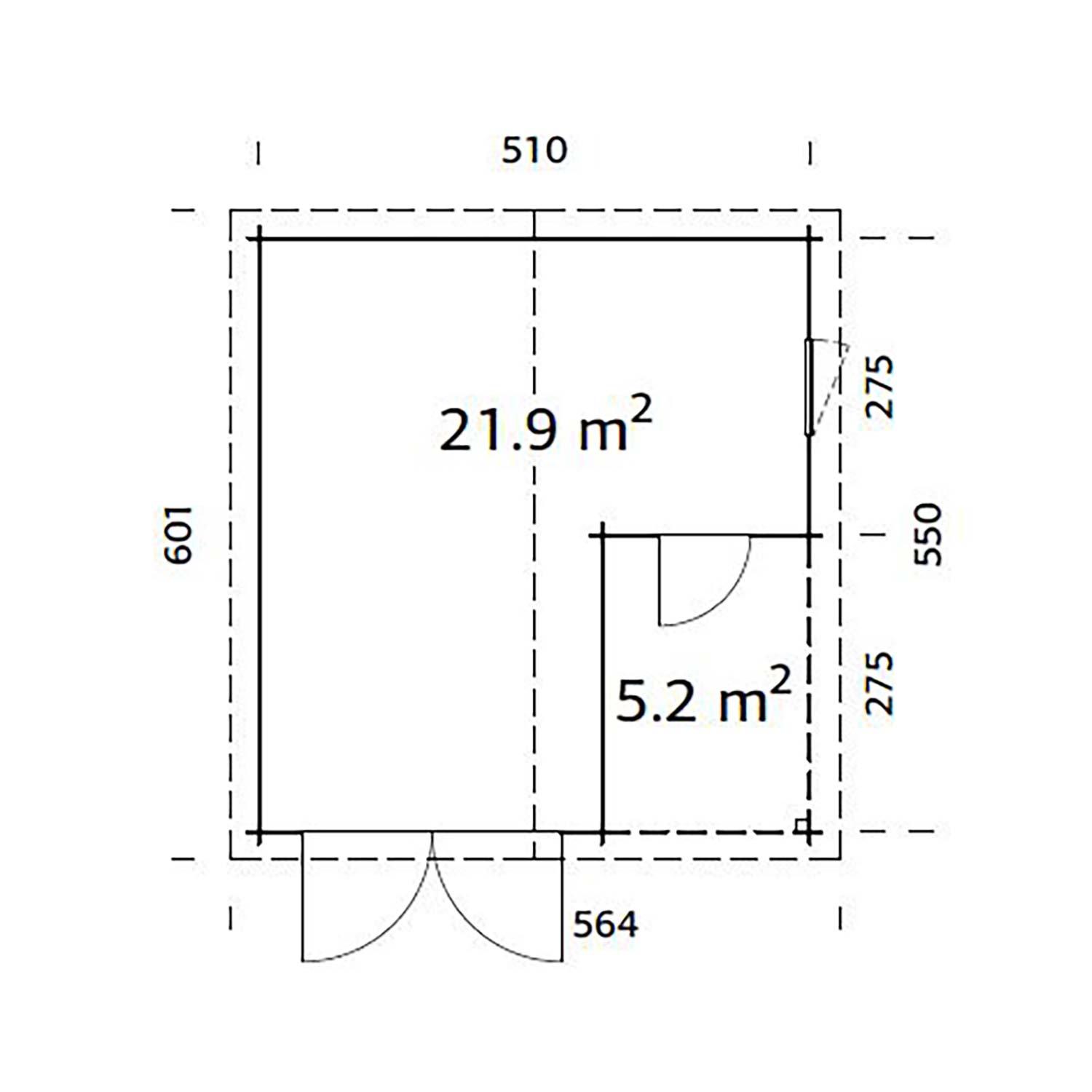 Wandstärke: 44 mm Material: nordisches Fichtenholz Dachform: Satteldach Farbbehandlung / Farbe: hellbraun tauchgrundiert Grundfläche: 21,9+5,2 m² Umbauter Raum: 60 m³ Tür:...