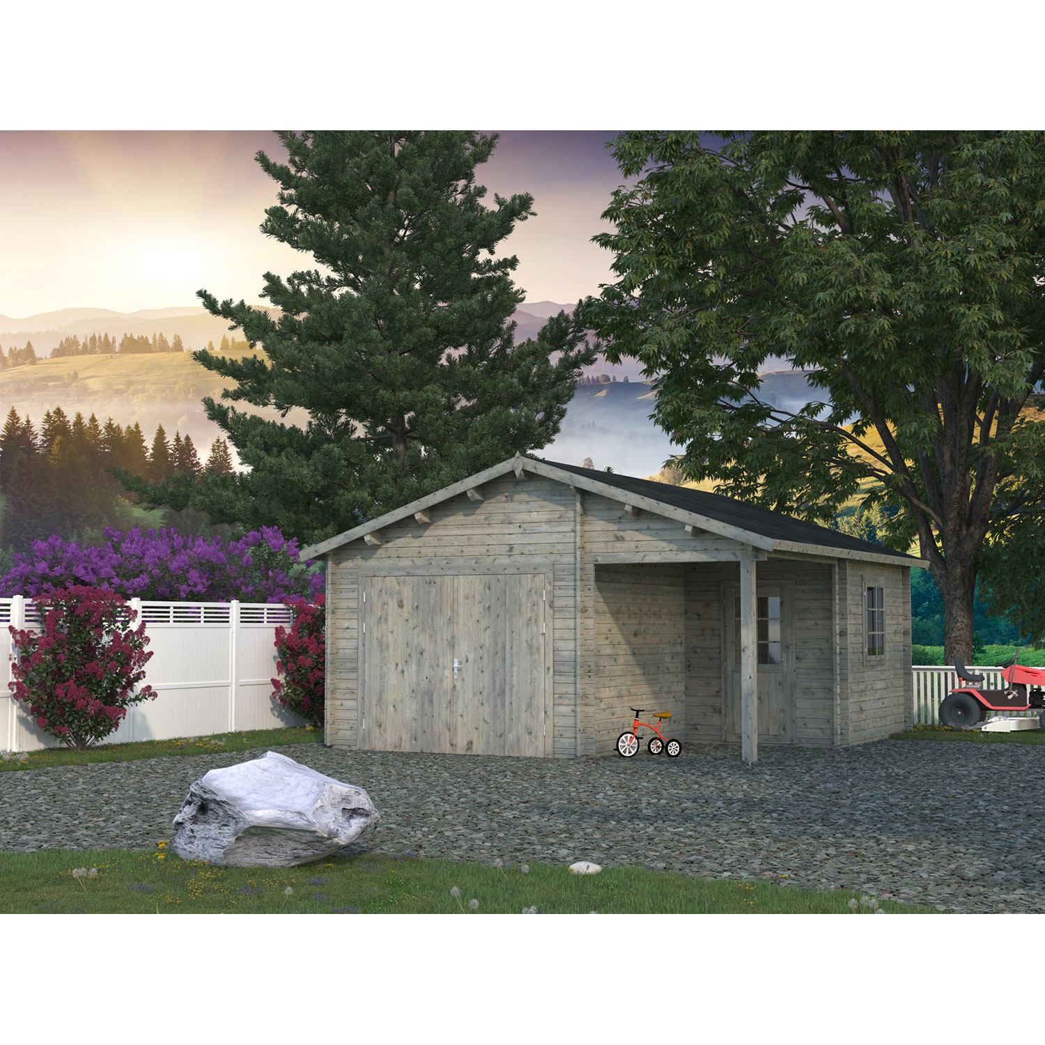 Die Palmako Garage Roger mit Holztor hat eine Grundfläche von 21,9+5,2 m² und eine Wandstärke von 44 mm. Die Garagenmodelle von Palmako sind aus nordischer Fichte gefertigt. Das schöne Design passt sich an jedes Grundstück perfekt an. Neben der Möglichkeit Ihr Fahrzeug unterzustellen kann es auch als Gerätehaus dienen. Das nordische Fichtenholz ist grau tauchgrundiert und durch die Herstellung aus robustem Massivholz besonders langlebig und beständig.