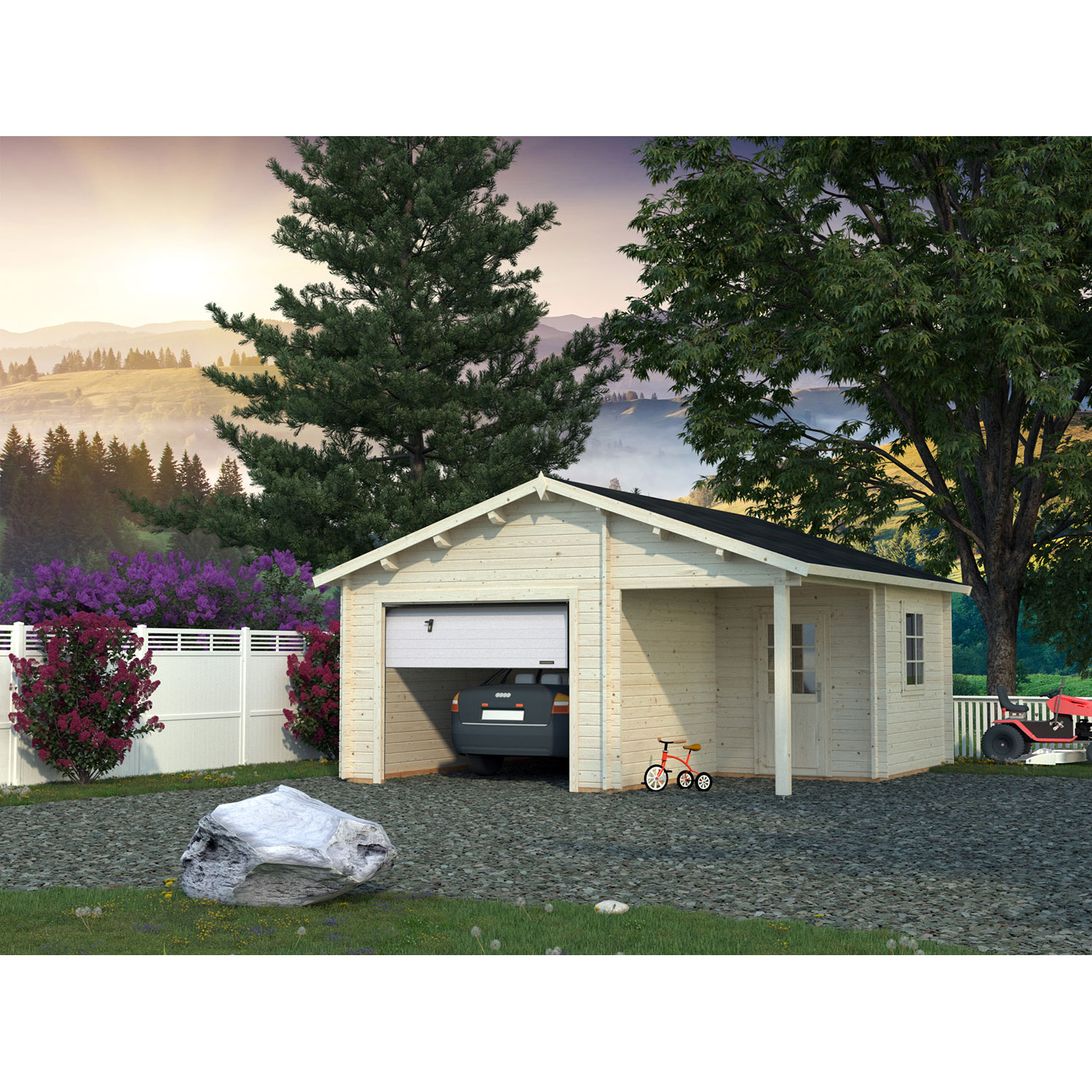 Die Palmako Garage Roger mit Sektionaltor hat eine Grundfläche von 21,9+5,2 m² und eine Wandstärke von 44 mm. Die Garagenmodelle von Palmako sind aus nordischer Fichte gefertigt. Das schöne Design passt sich an jedes Grundstück perfekt an. Neben der Möglichkeit Ihr Fahrzeug unterzustellen kann es auch als Gerätehaus dienen. Das nordische Fichtenholz ist naturbelassen und durch die Herstellung aus robustem Massivholz besonders langlebig und beständig.