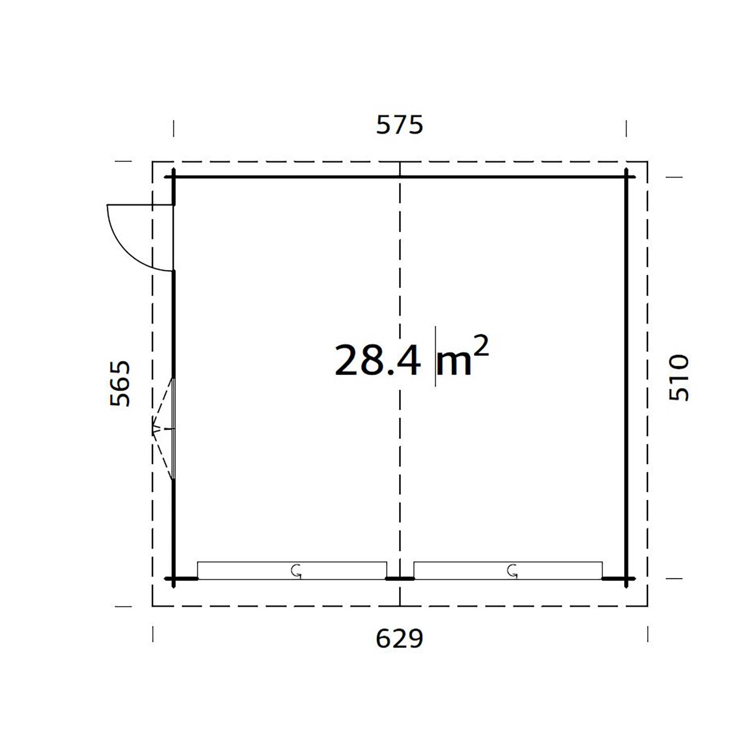 Wandstärke: 44 mm Material: nordisches Fichtenholz Dachform: Satteldach Farbbehandlung / Farbe: naturbelassen Grundfläche: 28,4 m² Umbauter Raum: 73,5 m³ Tür: Doppeltür Tür /...