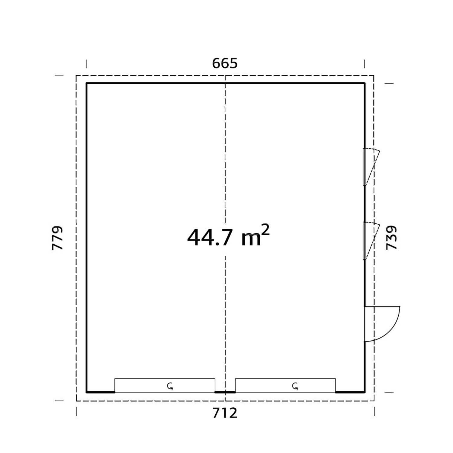 Wandstärke: 18 mm Material: nordisches Fichtenholz Dachform: Satteldach Farbbehandlung / Farbe: naturbelassen Grundfläche: 44,7 m² Umbauter Raum: 142 m³ Tür: Sektionaltor Tür /...