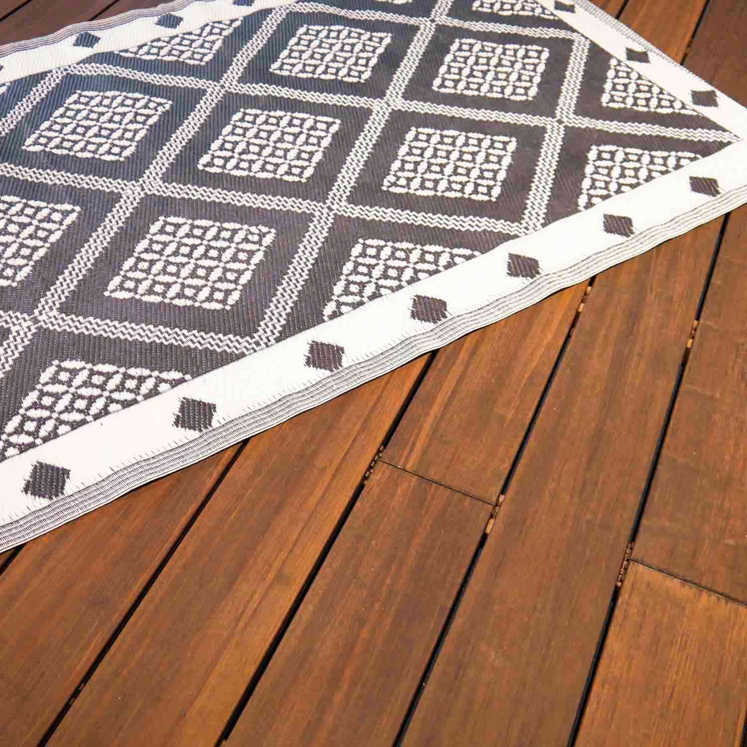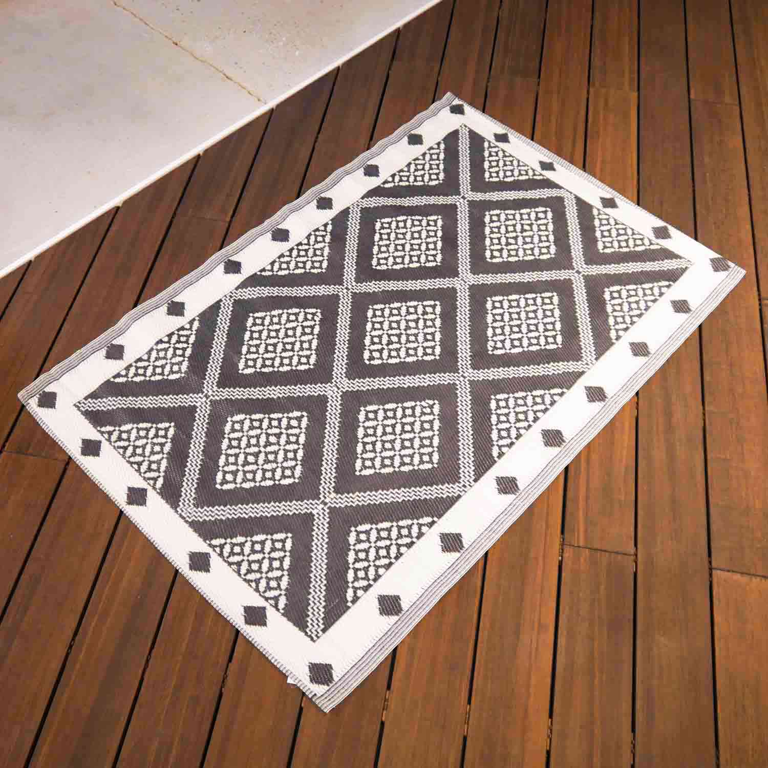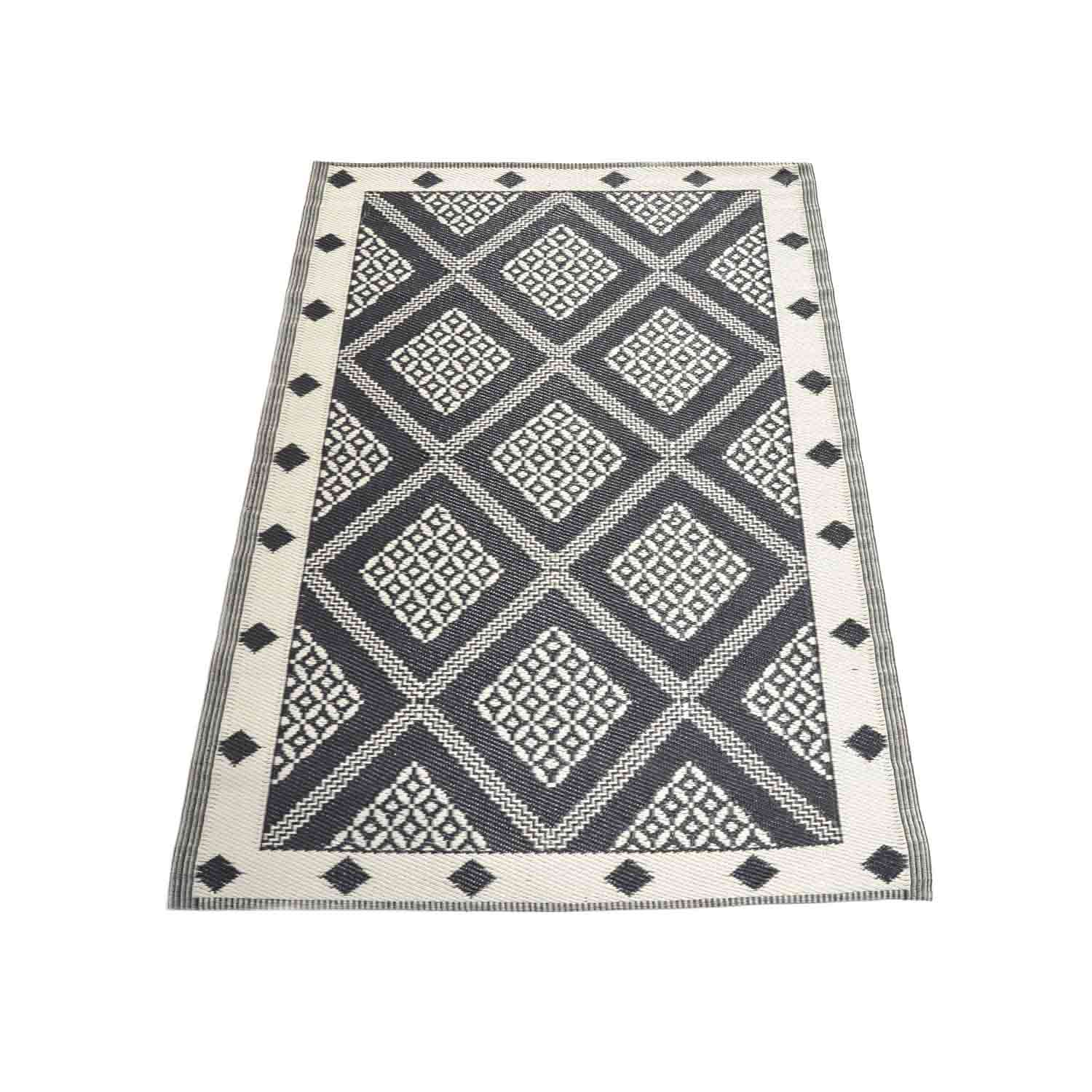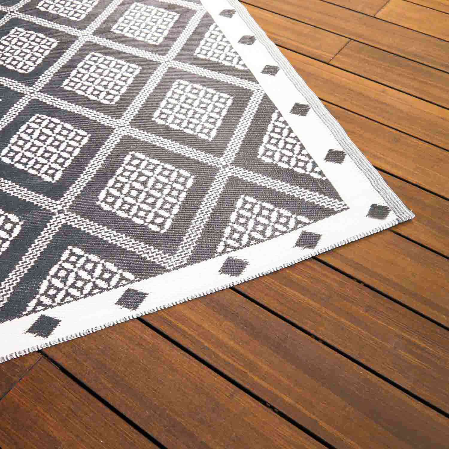 Dieser stilvolle Teppich aus recyceltem Polypropylen wird nicht nur ihren Außenbereich verschönern, sie tun auch etwas für die Umwelt. Mit seinem schönen schwarz/weissen Muster ist er ein Hingucker für Ihren Garten oder Ihre Terasse. Das Material ist Wasserdicht und Temperaturbeständig zwischen 0° und 100° Celsius. Dazu kommt die natürliche UV Resistenz des Stoffes. Zur Pflege des Teppichs ist nur die Handwäsche erlaubt.