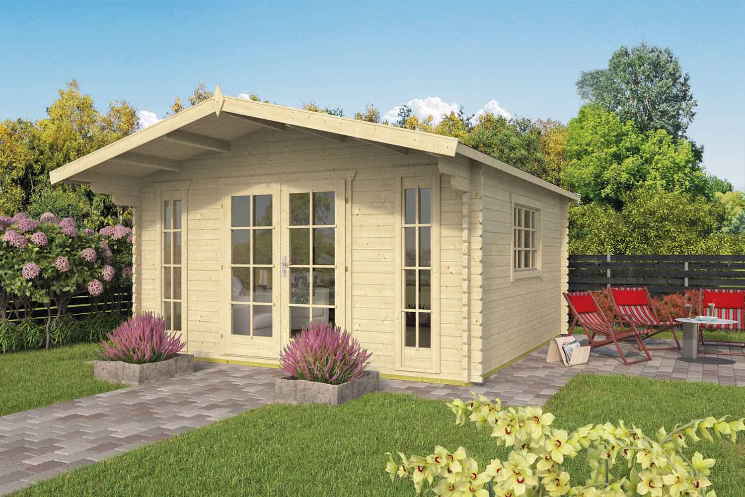 Das Blockhaus Bergild mit Satteldach und großen Vordach hat ein Maß von 4,30 x 4,30 m. Ausgestattet mit einer großflächig verglasten Vorderwand mit Doppeltüren und hohen festen Fenstern. Gartenbüro, Atelier oder Gartenhaus - die Verwendungsmöglichkeiten des 45 mm Berhild Blockhauses mit Doppelverglasung sind endlos! Eine Gewissheit ist jedoch der geräumige und helle Innenraum - eine großflächig verglaste Vorderwand mit Doppeltüren und hohen feststehenden Fenstern lässt viel natürliches Licht herein. Die Bergild profitiert außerdem von einem großen Vordach. Dieses Vordach schützt die Vorderseite der Kabine vor dem Wetter und bietet willkommenen Schatten vor der Sommersonne. Für den Bau wird erstklassiges Fichtenholz verwendet, das wegen seiner dichten Maserung ausgewählt wurde. Sie erhalten das Blockhaus unbehandelt, ein Anstrich nach Erhalt wird empfohlen.