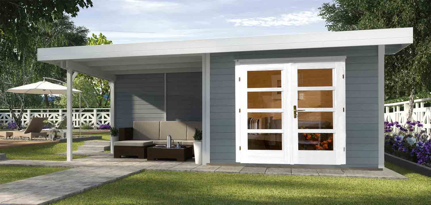 Wandstärke: 28 mm Material: europäische Fichte Dachform: Flachdach Dachstärke: 19 mm inkl. 19 mm starken Massivholzboden inkl. Doppeltür Bauweise: Blockbohlenbauweise Farbe: grau...