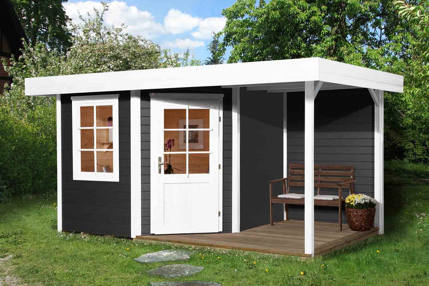 Das Gartenhaus bekommt durch den überdachten Anbau einen lässigen Charakter. Das Flachdach besteht aus Massivholz, sodass das Gartenhaus rasch gegen von oben kommenden Witterungseinflüssen geschützt ist.