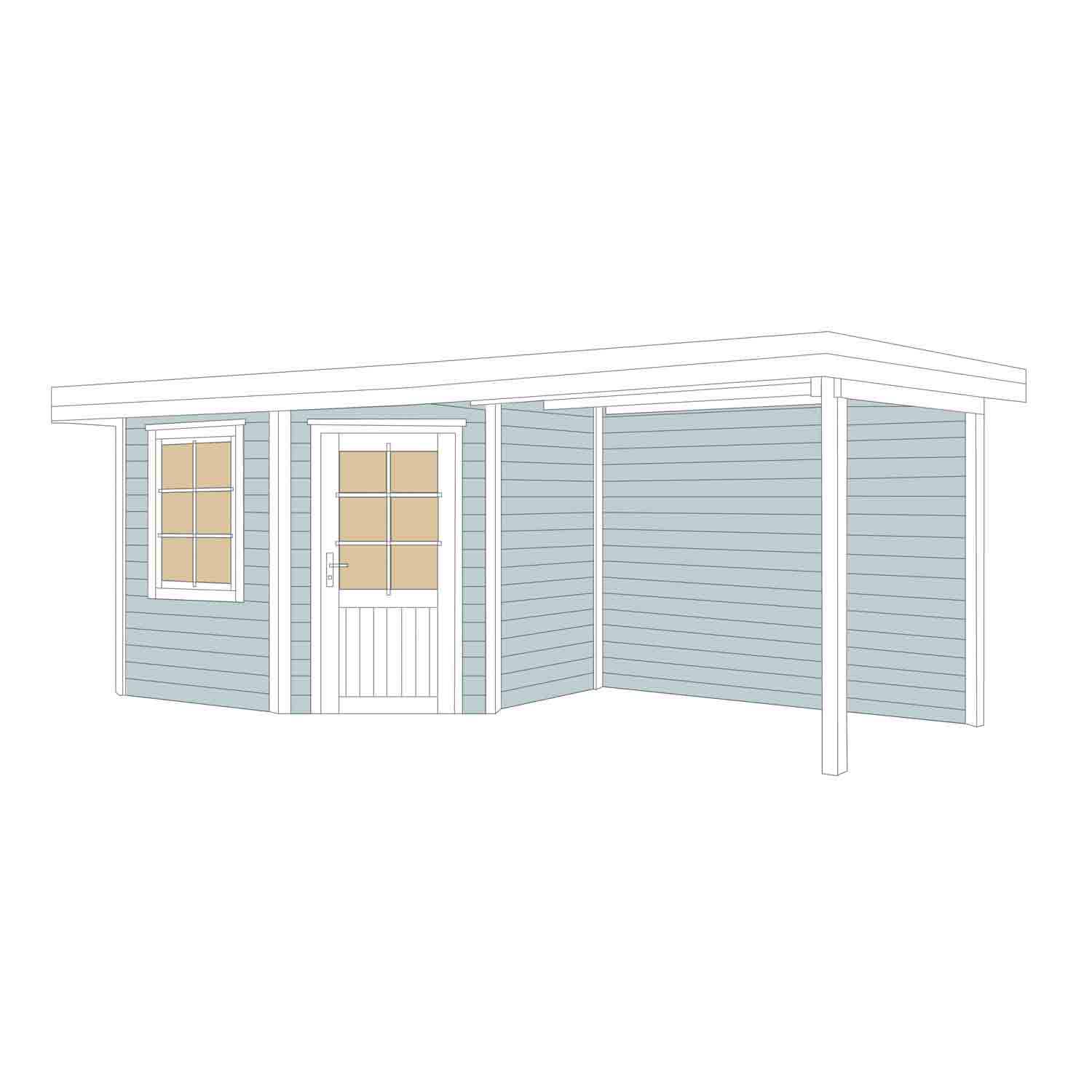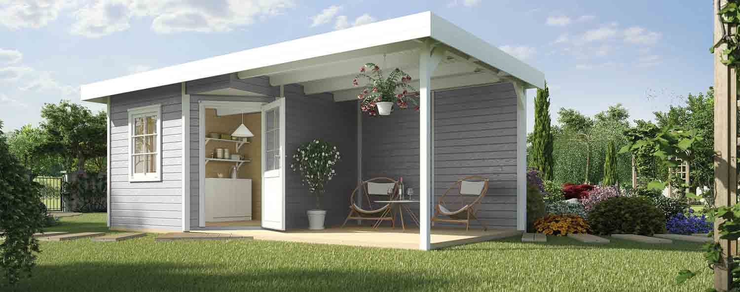 Das Gartenhaus bekommt durch den überdachten Anbau einen lässigen Charakter. Das Flachdach besteht aus Massivholz, sodass das Gartenhaus rasch gegen von oben kommenden Witterungseinflüssen geschützt ist.