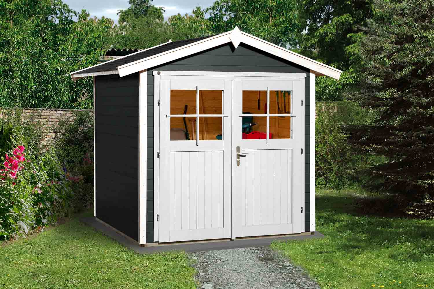 Die Doppeltür bringt Licht ins Innere und sorgt für ein angenehmes Wohlempfinden. Das Gartenhaus eignet sich ebenfalls als Geräteschuppen und bietet genug Platz für Kaminholz, Gartenmöbel oder Gartengeräte.