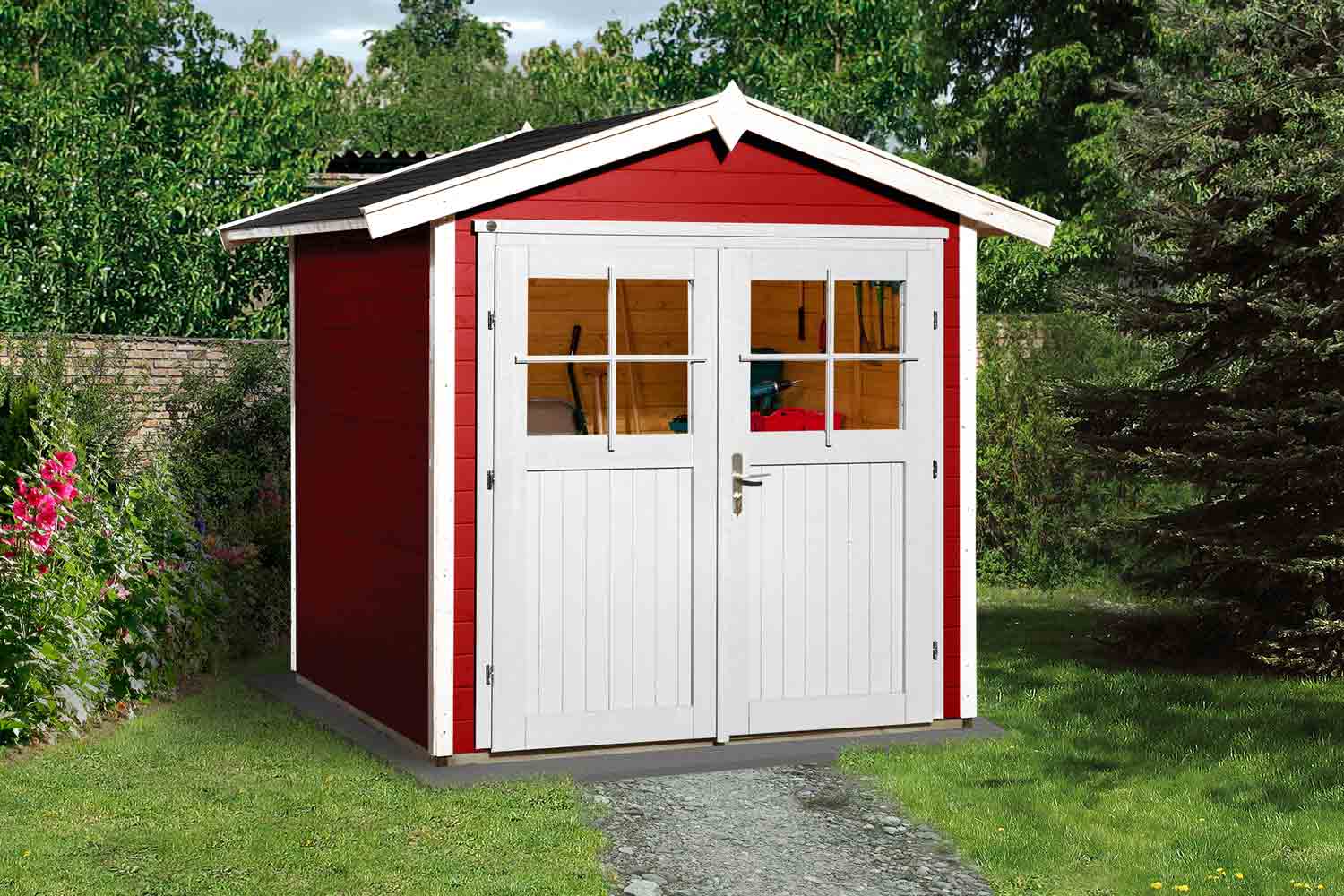 Die Doppeltür bringt Licht ins Innere und sorgt für ein angenehmes Wohlempfinden. Das Gartenhaus eignet sich ebenfalls als Geräteschuppen und bietet genug Platz für Kaminholz, Gartenmöbel oder Gartengeräte.