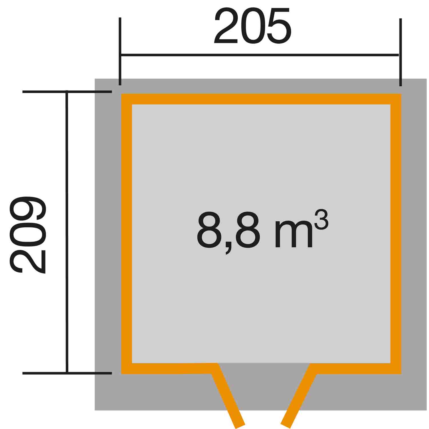 • Sockelmaß in cm: B 205 x T 209