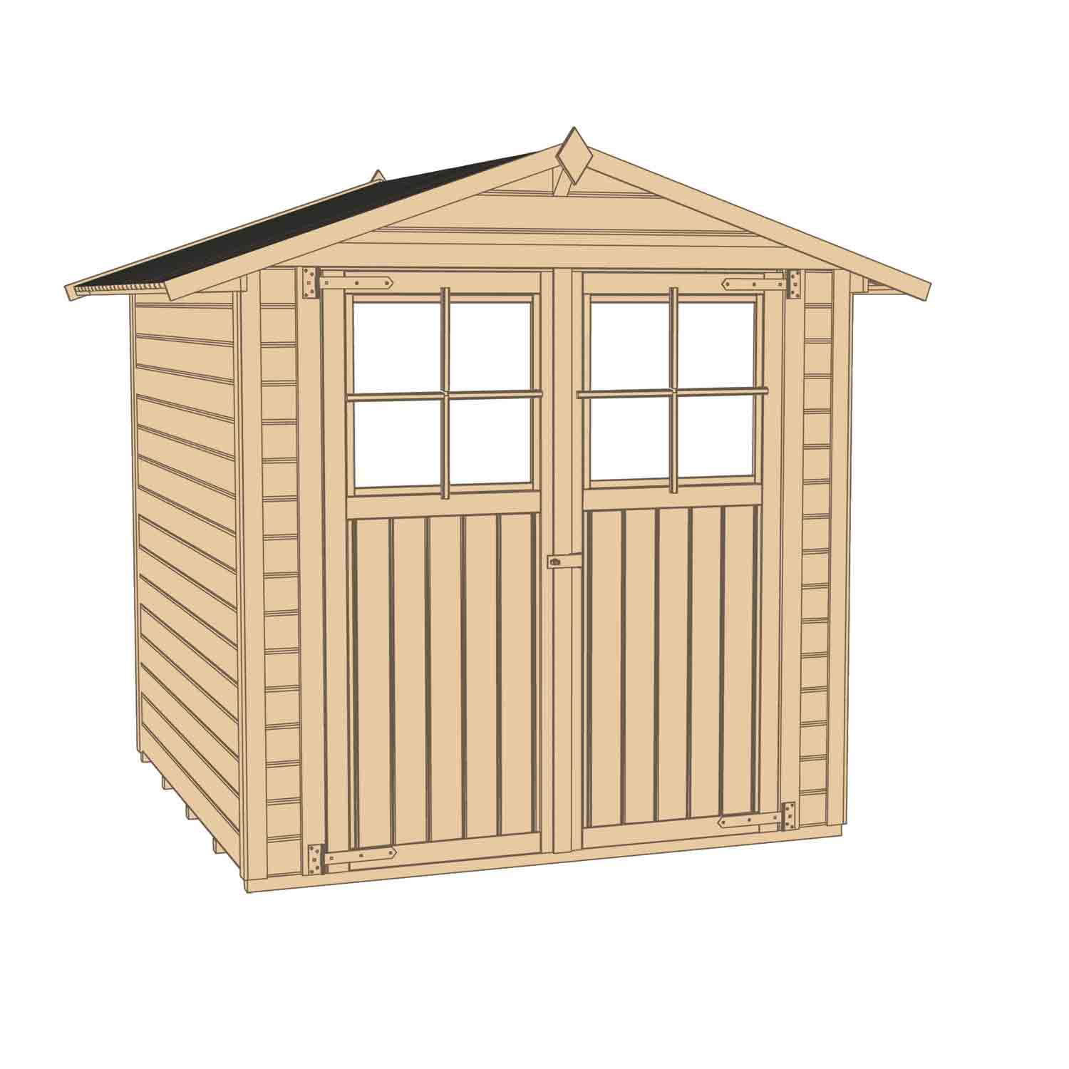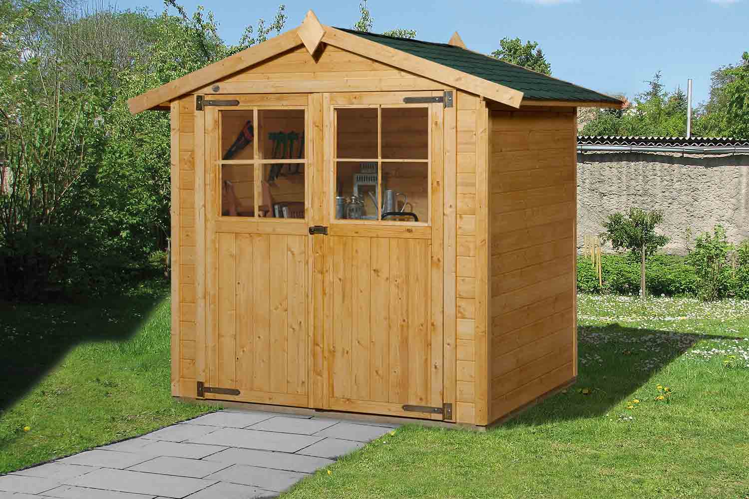 Die Doppeltür bringt Licht ins Innere und sorgt für ein angenehmes Wohlempfinden. Das Gartenhaus eignet sich ebenfalls als Geräteschuppen und bietet genug Platz für Kaminholz, Gartenmöbel oder Gartengeräte.