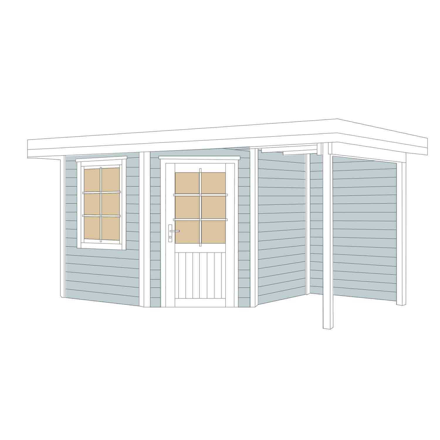 Das Gartenhaus bekommt durch den überdachten Anbau mit Rückwand einen lässigen Charakter. Das Flachdach besteht aus Massivholz, sodass das Gartenhaus rasch gegen von oben kommenden Witterungseinflüssen geschützt ist.