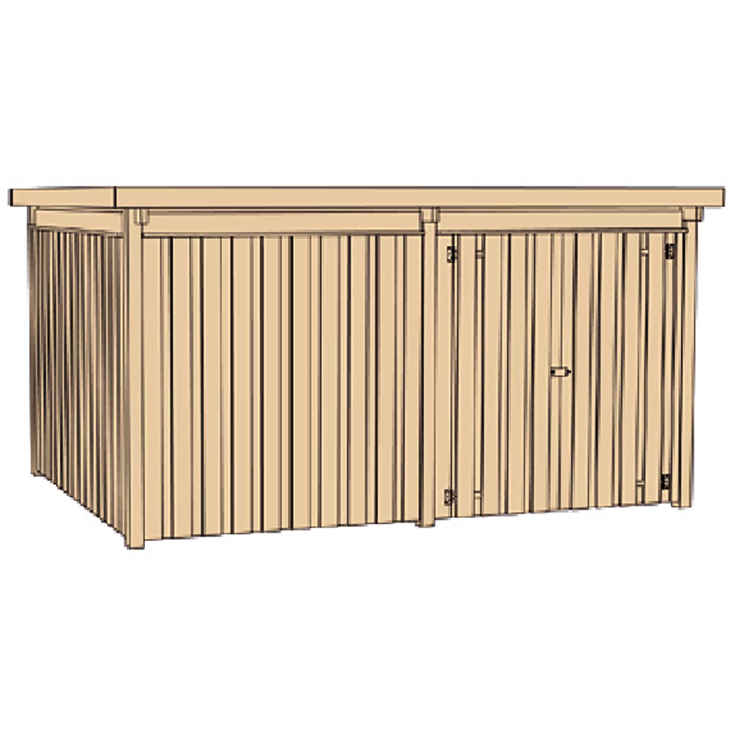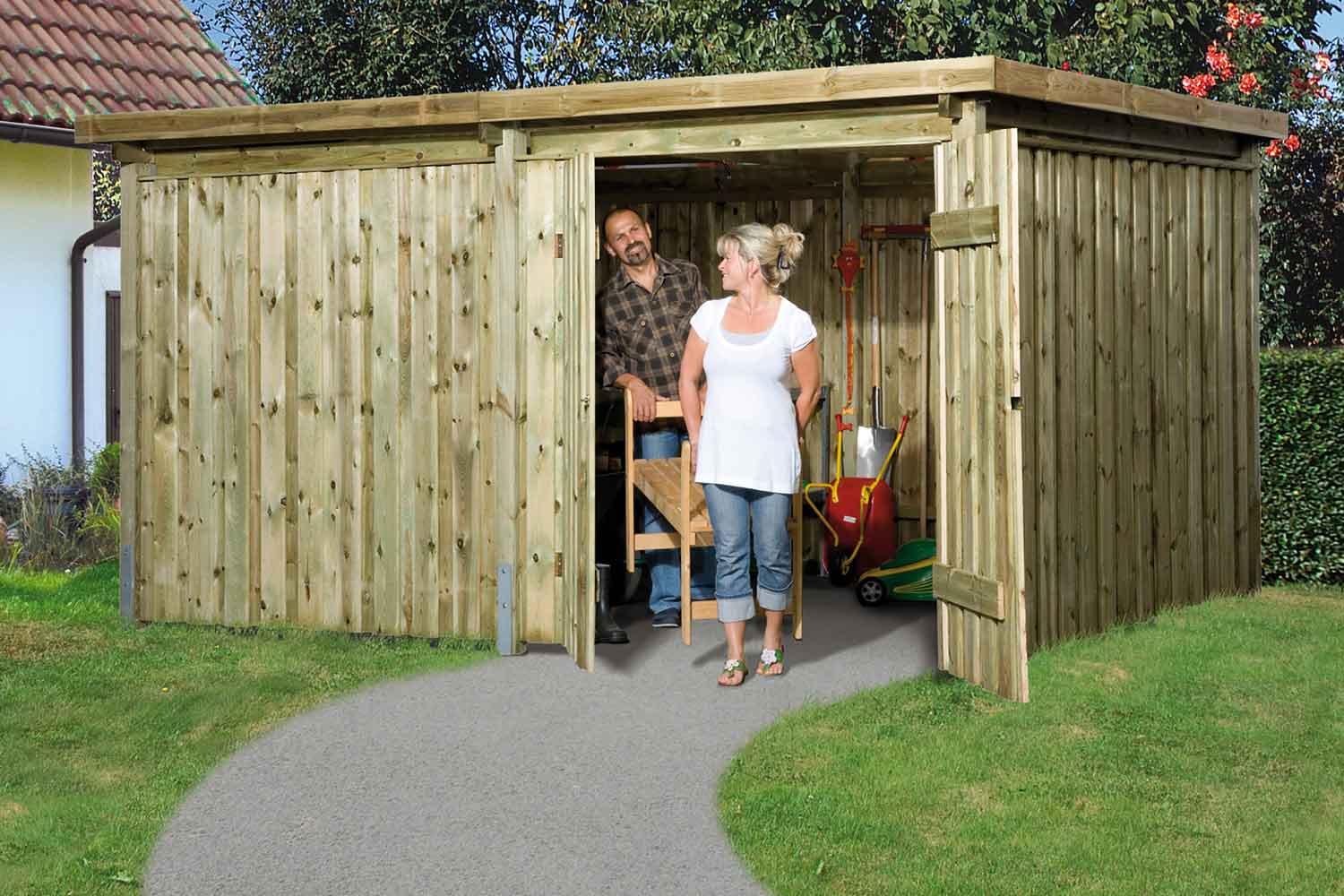 Diese Variante verfügt über einen großen Flachdachschuppen für Ihre Geräte, Werkzeuge, Fahrräder oder Ähnliches.