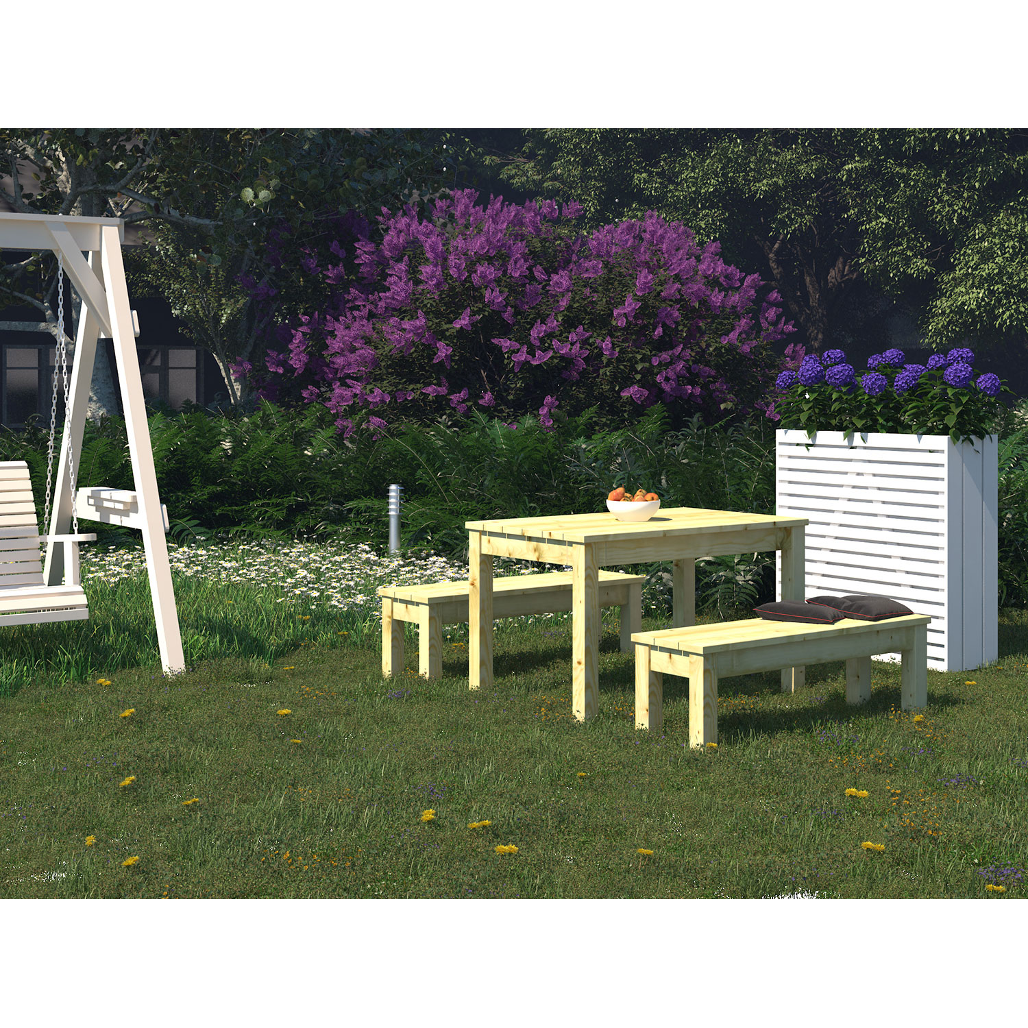Die Palmako Sitzgruppe passt einfach in jeden Garten und auf jede Terrasse. Mit einer Breite von 120 cm finden ca. 4 Personen am Tisch Platz. Das vorbehandelte Holz aus nordischer Fichte ist robust und langlebig zugleich. Einem Grillabend oder Picknick mit Freunden oder Familie steht nicht mehr im Wege.