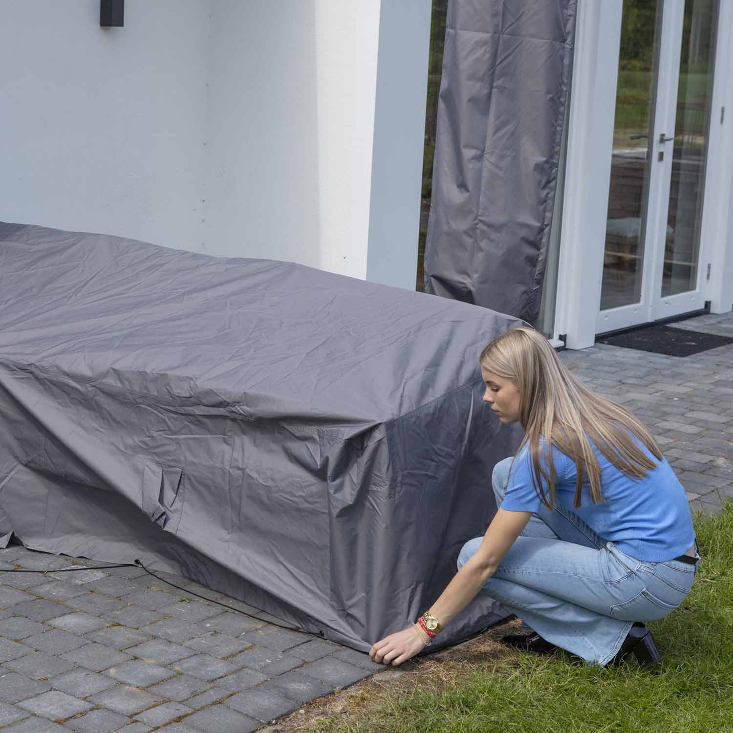 Schützen Sie Ihre Gartenmöbel vor jeglichen Wetterbedingungen mit der hochwertigen Gartenmöbelhülle von Madison. Die wasserabweisende Oberfläche und die versiegelten Nähte sorgen für den optimalen Schutz Ihrer Möbel. Die Hülle besteht aus UV-beständigem Ripstop-Polyester und schützt somit auch gegen Verfärbungen durch Sonneneinstrahlung, sowie auch gegen Staub. Die Plane ist atmungsaktiv und bietet somit eine geringe Kondensation. Für eine Ideale Befestigung sorgt ein Kordelzug, welcher mit einem Stopper ausgestattet ist. Bei Nichtgebrauch der Hülle kann diese platzsparend verstaut werden.