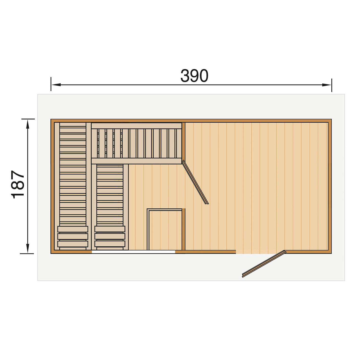 Die Sauna verfügt über ein Außenmaß von 415 cm x 250 cm. Die Grundfläche der Sauna beträgt 7,29 m².