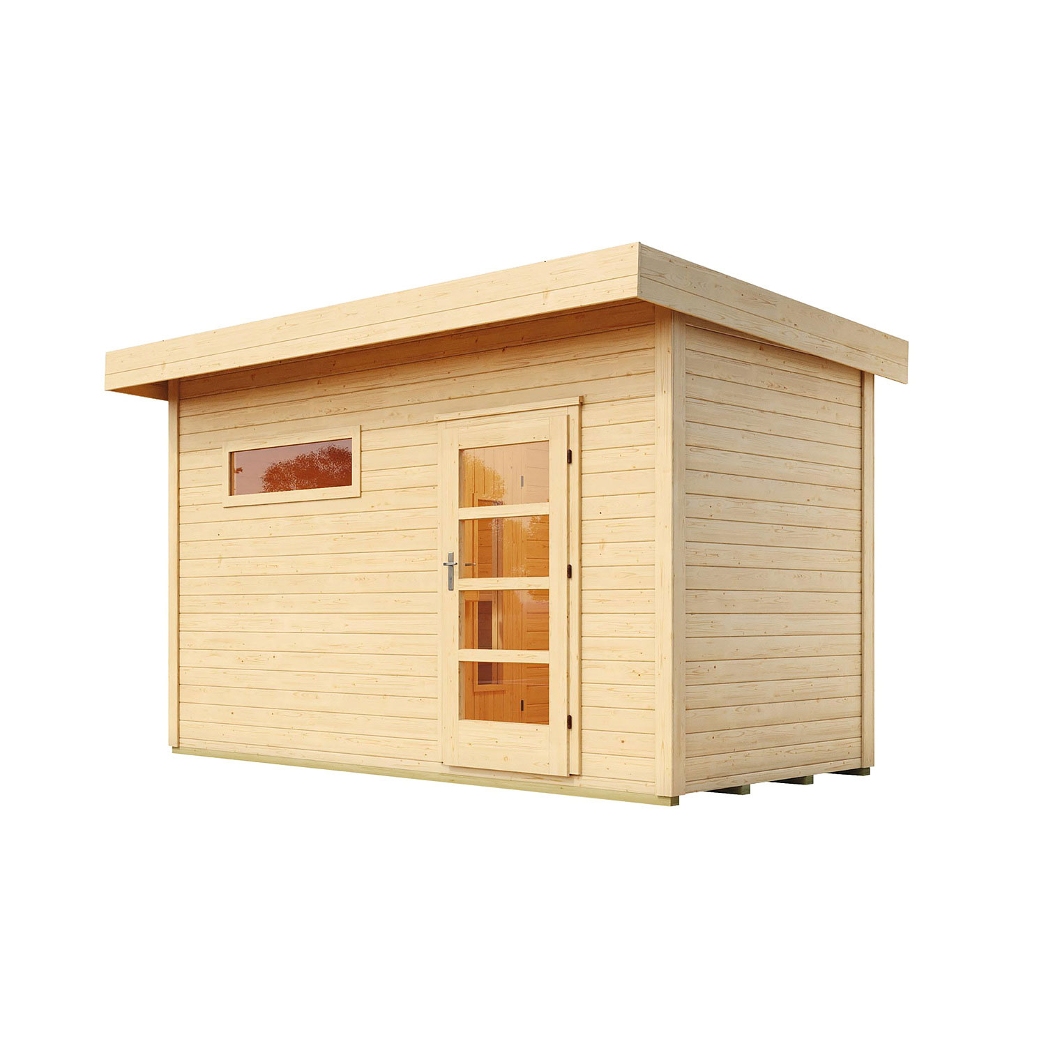 mit 19 mm Massivholzdach inklusive hochwertiger Rahmentür mit Lichtausschnitten inklusive schmalen, feststehenden Fenster inklusive speziell isolierter Zwischendecke inklusive großem...