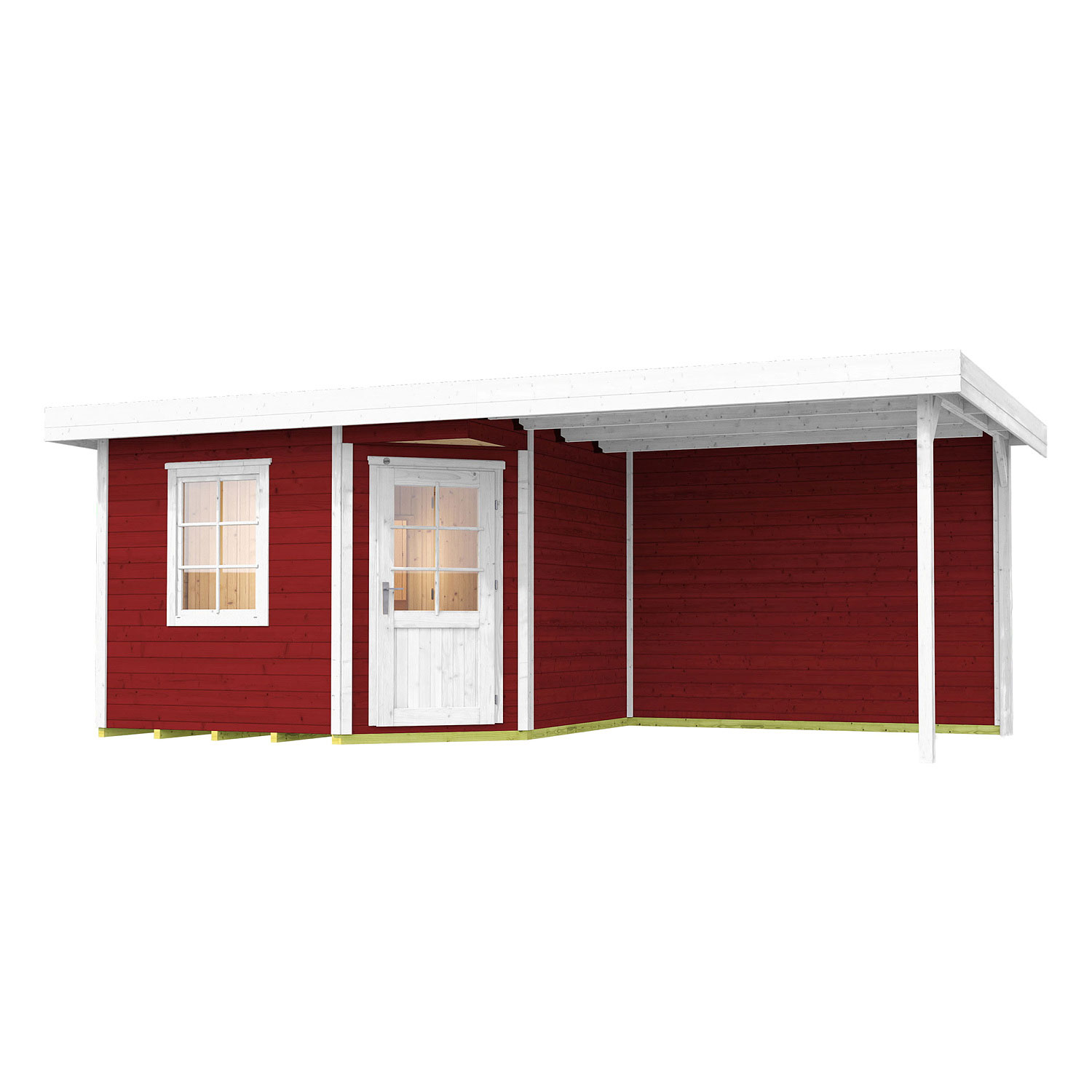 Saunahaus aus 28 mm Blockbohlen Flachdach mit Anbau und Sichtschutzwand inklusive hochwertiger Elementsauna "Varberg 3" spezielle Holztür für beste Isolation und optimales Saunaklima...