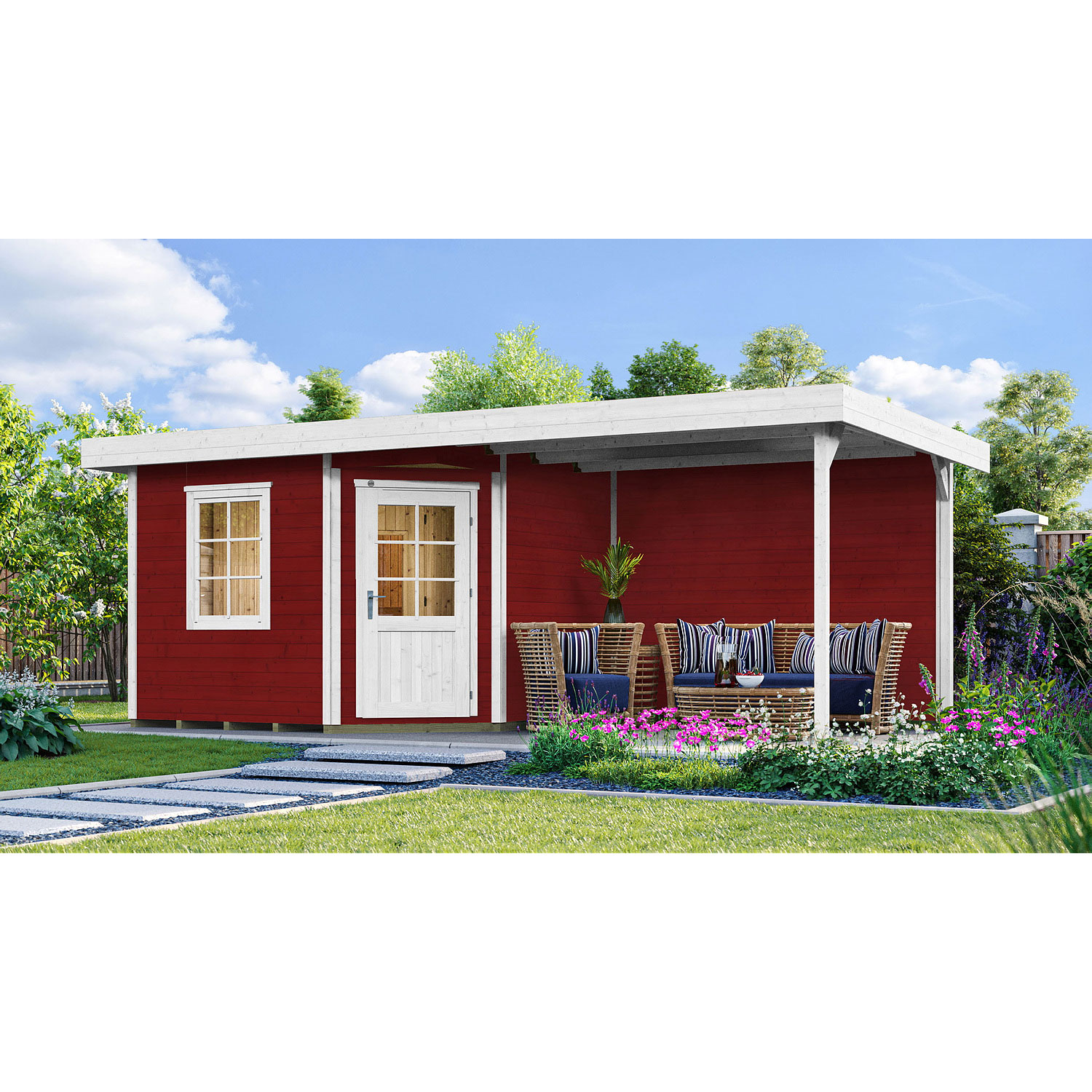Mit dem Design-Saunahaus Salo können Sie saunieren und gleichzeitig entspannen. Das Saunahaus mit Eckeinstieg ist wie geschaffen für Ihre eigene Wohlfühloase im Garten. Die mitgelieferte Sichtschutzwand eignet sich ideal für eine gemütliche Sitzecke zum Entspannen nach dem Saunagang.