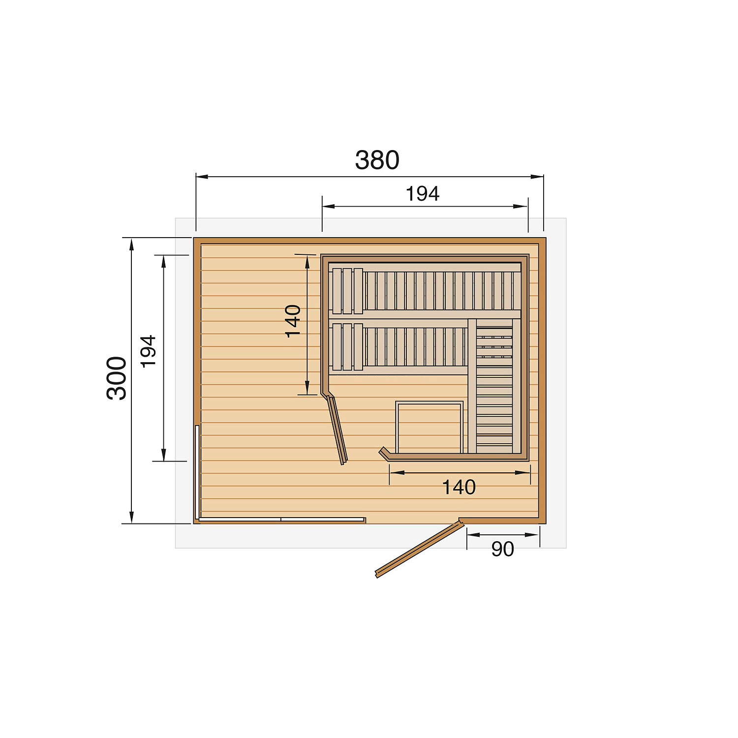 Die Sauna verfügt über ein Außenmaß von 388 cm x 314 cm. Die Grundfläche der Sauna beträgt 11,40 m².