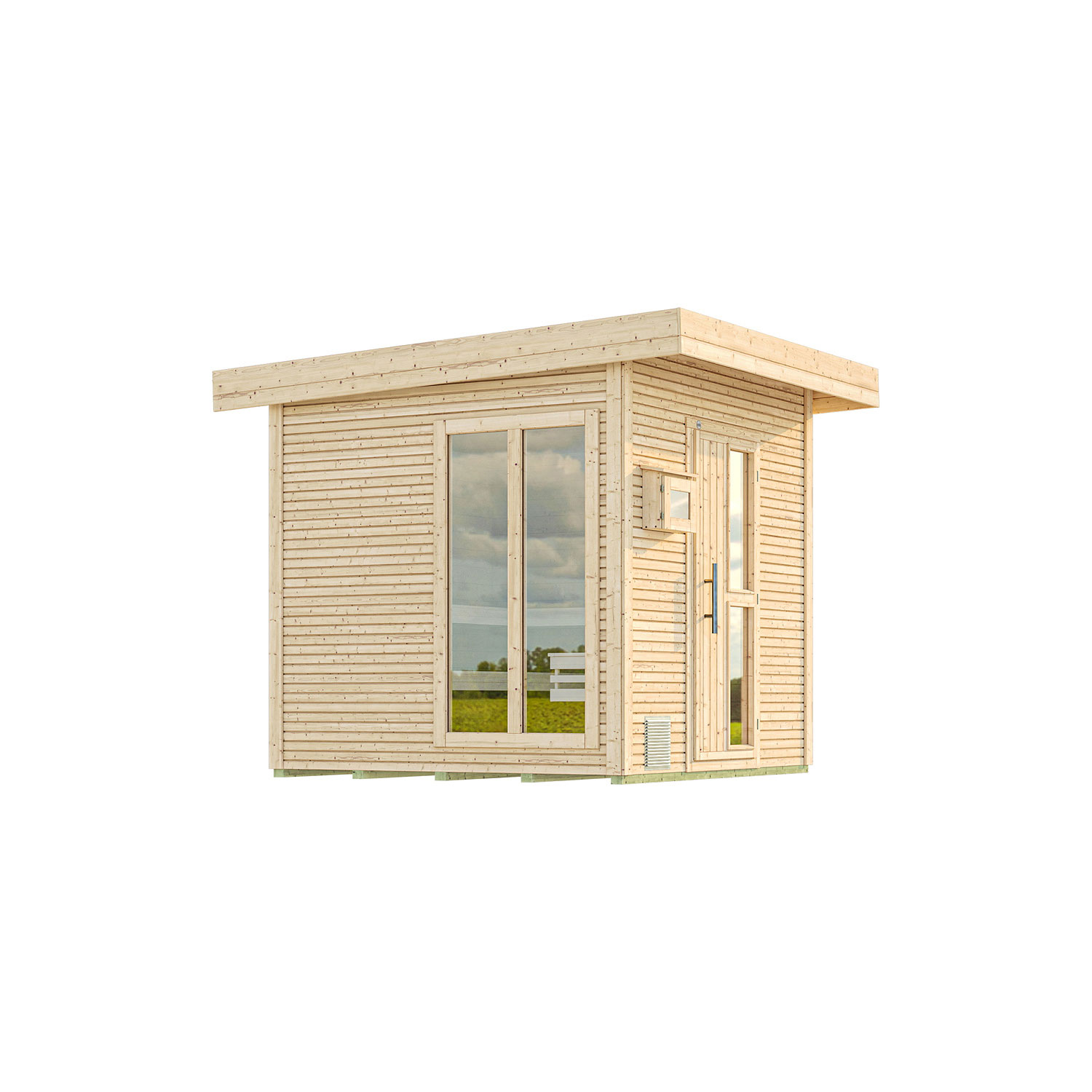 Mit dem Design-Saunahaus Kuopio OS Sparset können Sie saunieren und gleichzeitig entspannen. Die speziell isolierte Tür und Zwischendecke sorgen für optimales Raumklima und die Wärme bleibt im Inneren des Hauses.