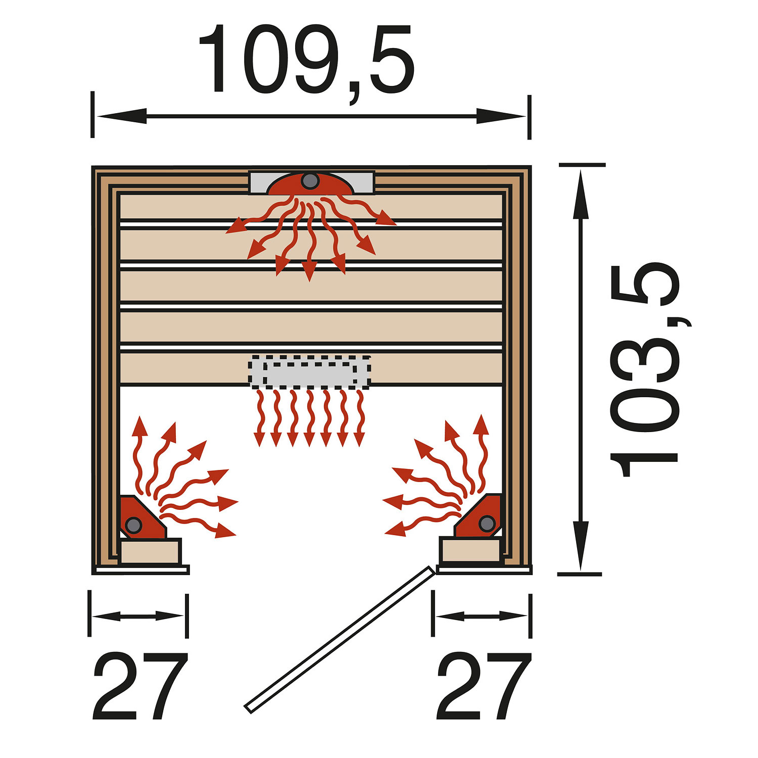 Die Kabine verfügt über ein Außenmaß von 109,5 cm x 103,5 cm. Die Grundfläche der Kabine beträgt 1,11 m².