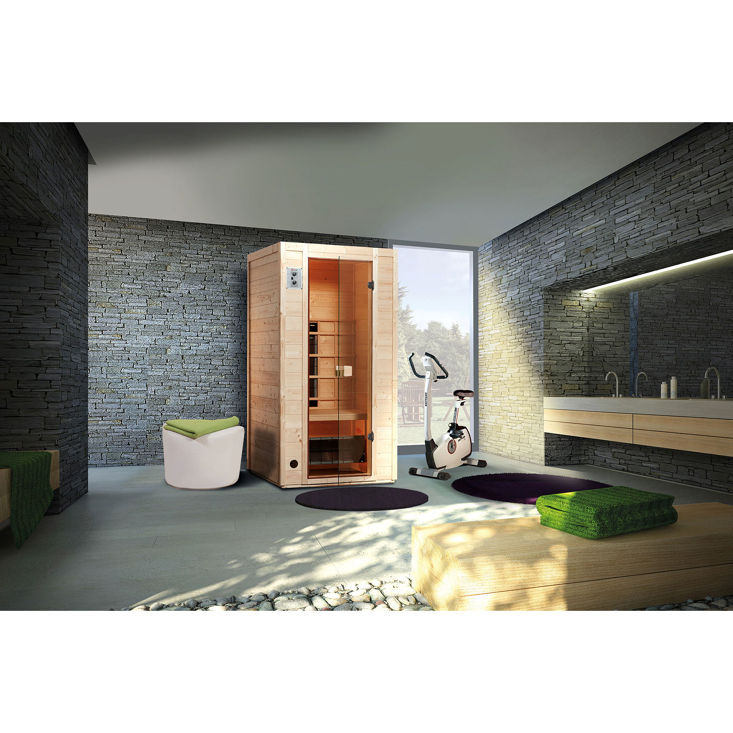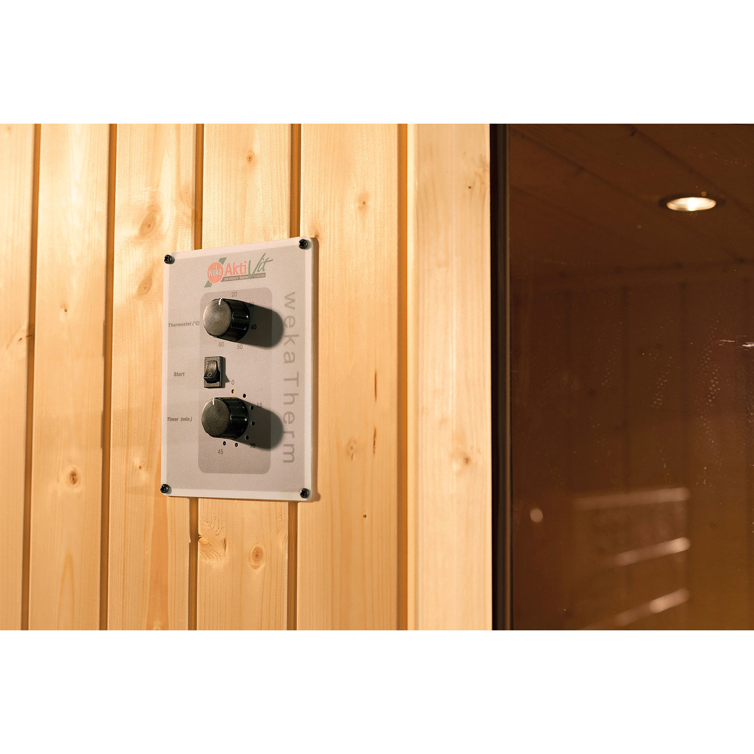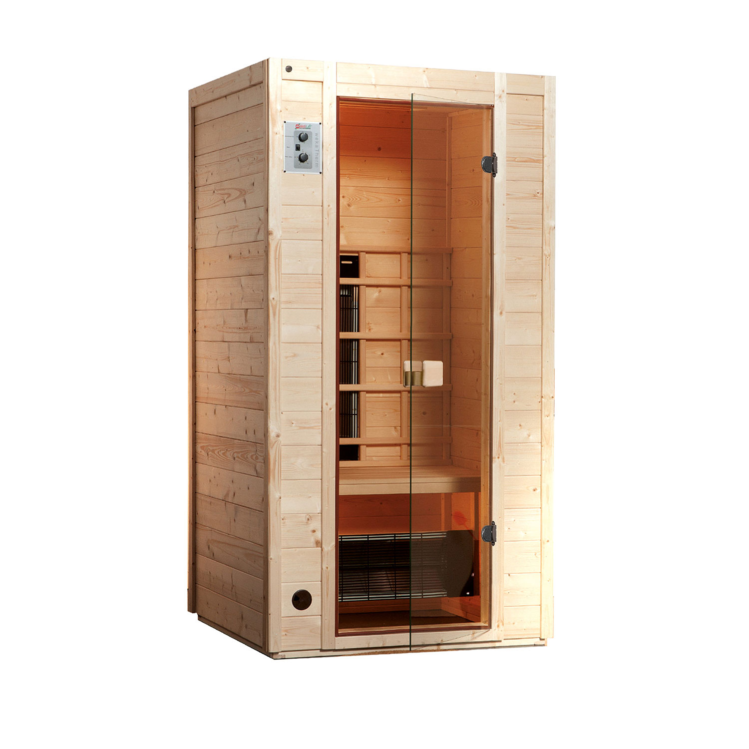 Die schöne Weka Infrarotkabine Vaala 1 wurde aus europäischer Fichte und mit 19 mm starken Wandbrettern gefertigt. Das sorgt für besondere Dichte und angenehm natürliches Raumklima zum Entspannen.