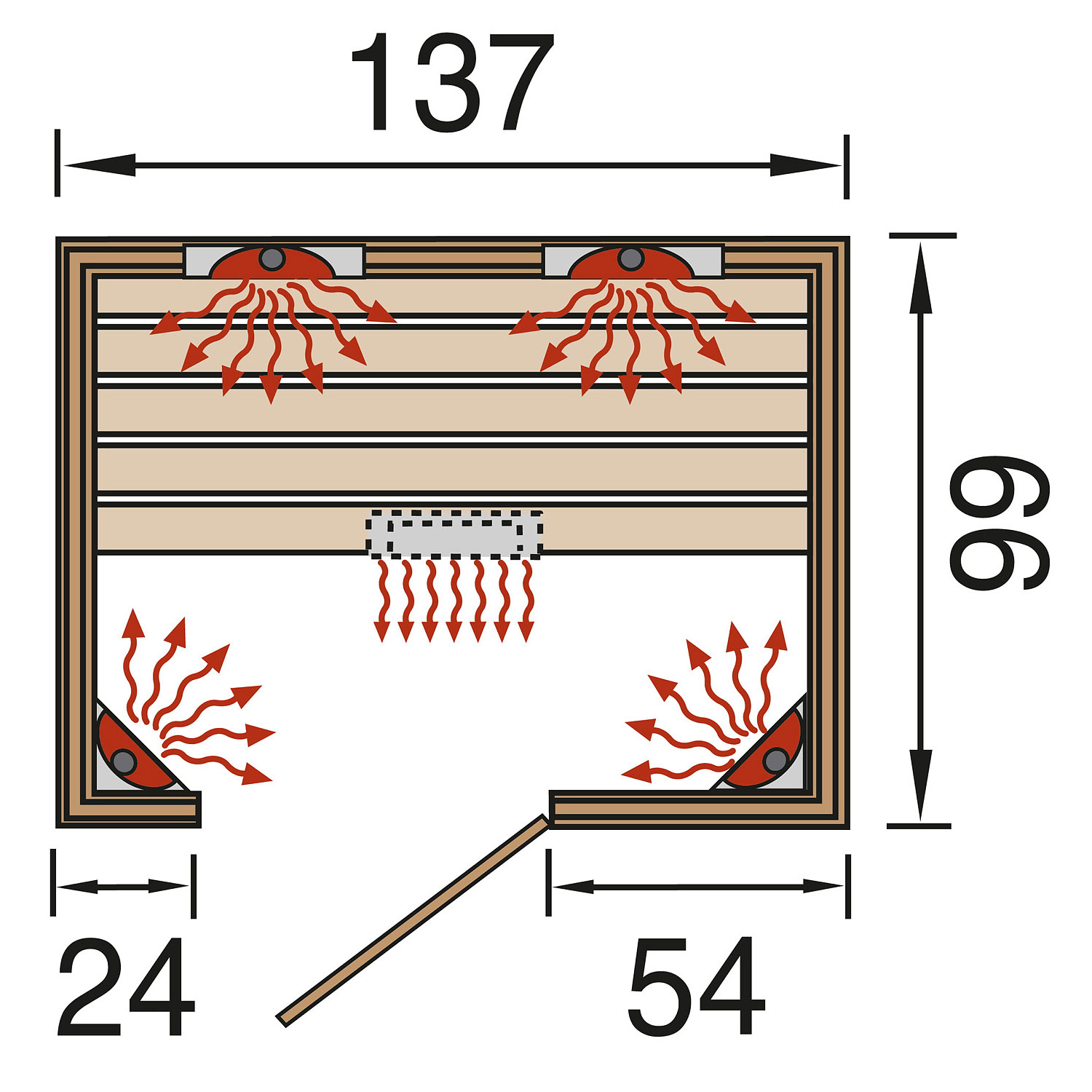 • gezielte Wärmeabgabe durch Rücken-, Bein- und Frontstrahler (WEKA-Linienstrahler)