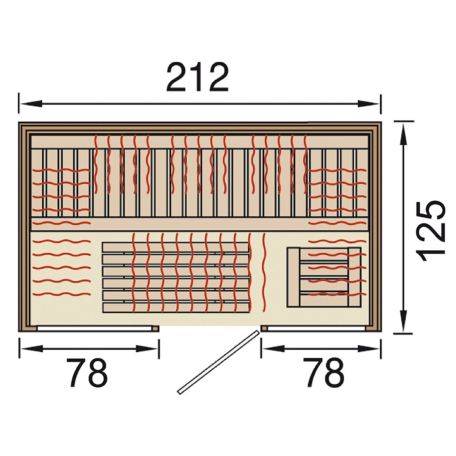 Die Kabine verfügt über ein Außenmaß von 212 cm x 125 cm. Die Grundfläche der Kabine beträgt 2,65 m².