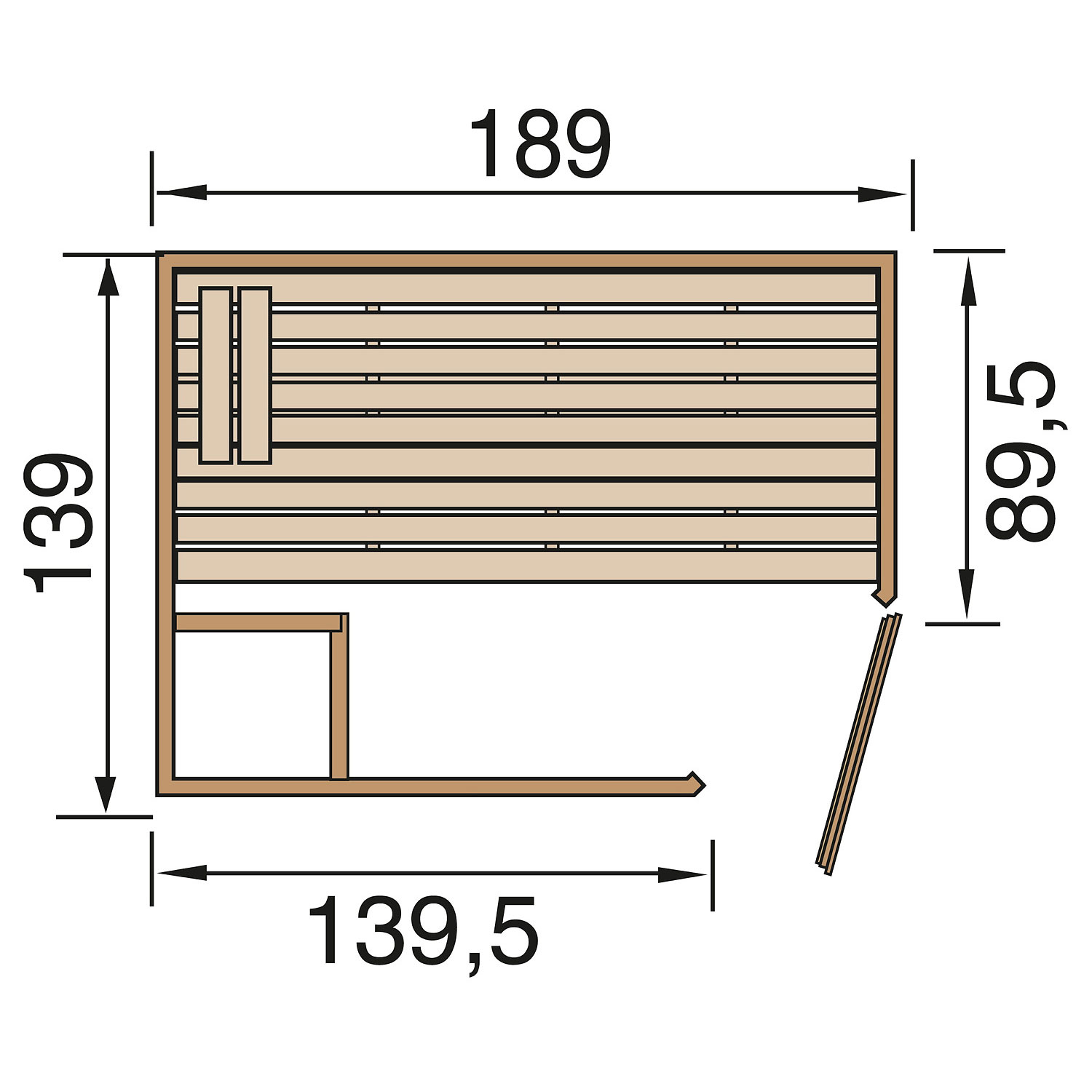 Die Sauna verfügt über ein Außenmaß von 189 cm x 139 cm. Die Grundfläche der Sauna beträgt 2,56 m².