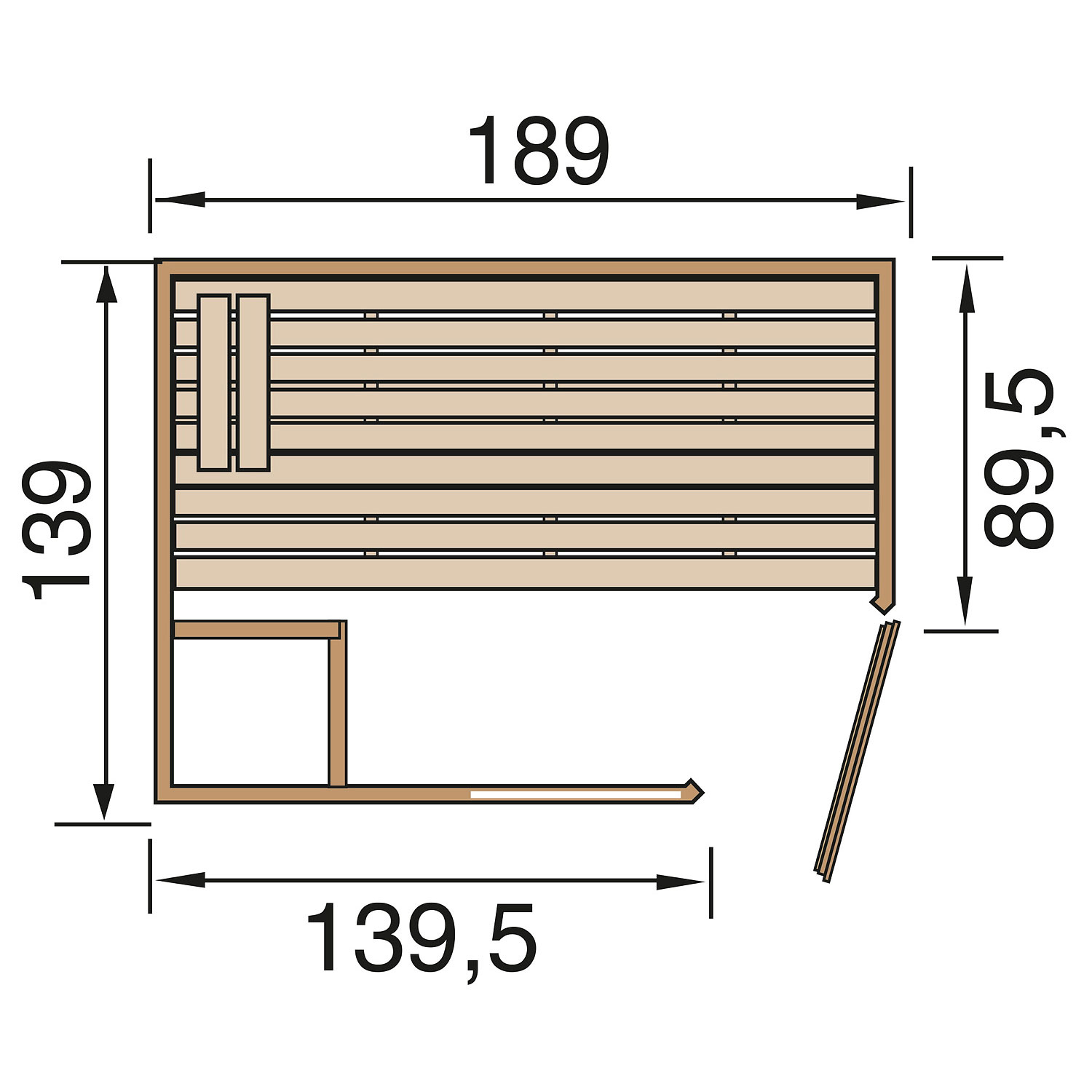 Die Sauna verfügt über ein Außenmaß von 189 cm x 139 cm. Die Grundfläche der Sauna beträgt 2,56 m².