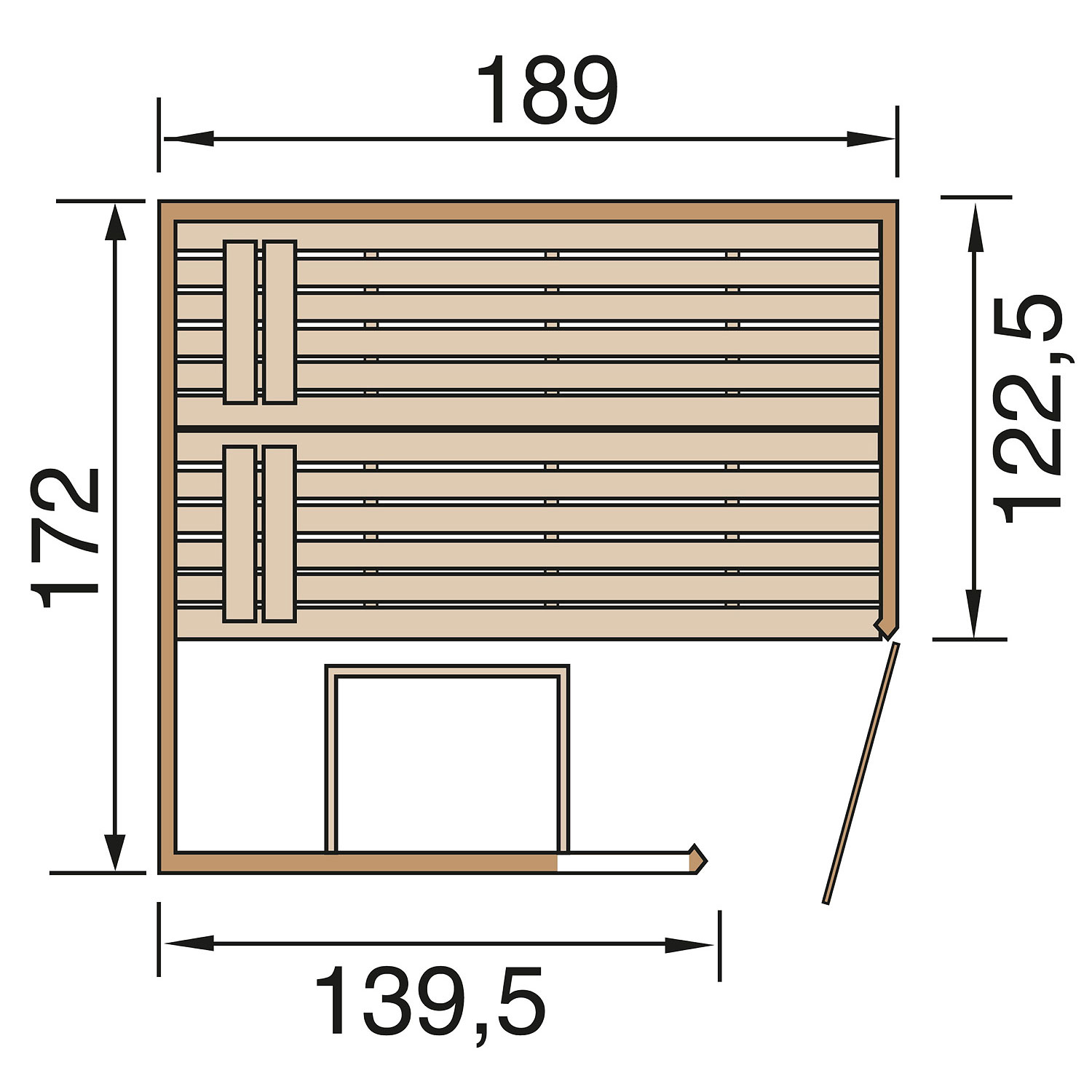 Die Sauna verfügt über ein Außenmaß von 189 cm x 172 cm. Die Grundfläche der Sauna beträgt 3,18 m².