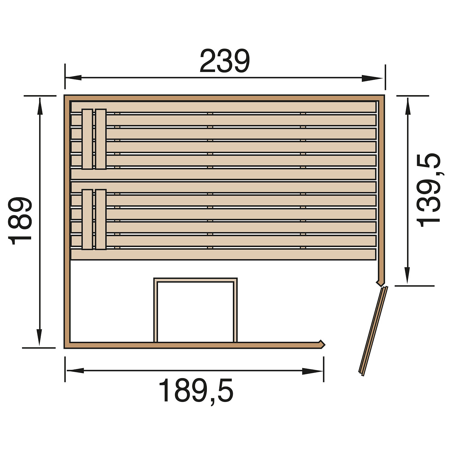 Die Sauna verfügt über ein Außenmaß von 239 cm x 189 cm. Die Grundfläche der Sauna beträgt 4,43 m².