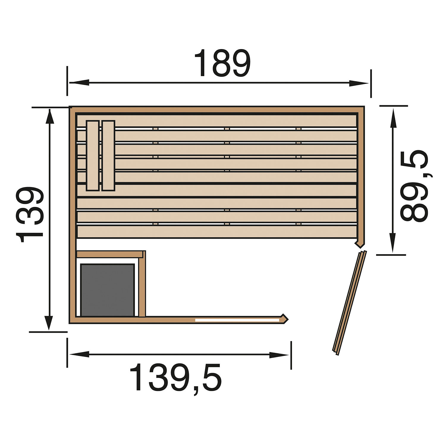 Die Sauna verfügt über ein Außenmaß von 189 cm x 139 cm. Die Grundfläche der Sauna beträgt 2,56 m².