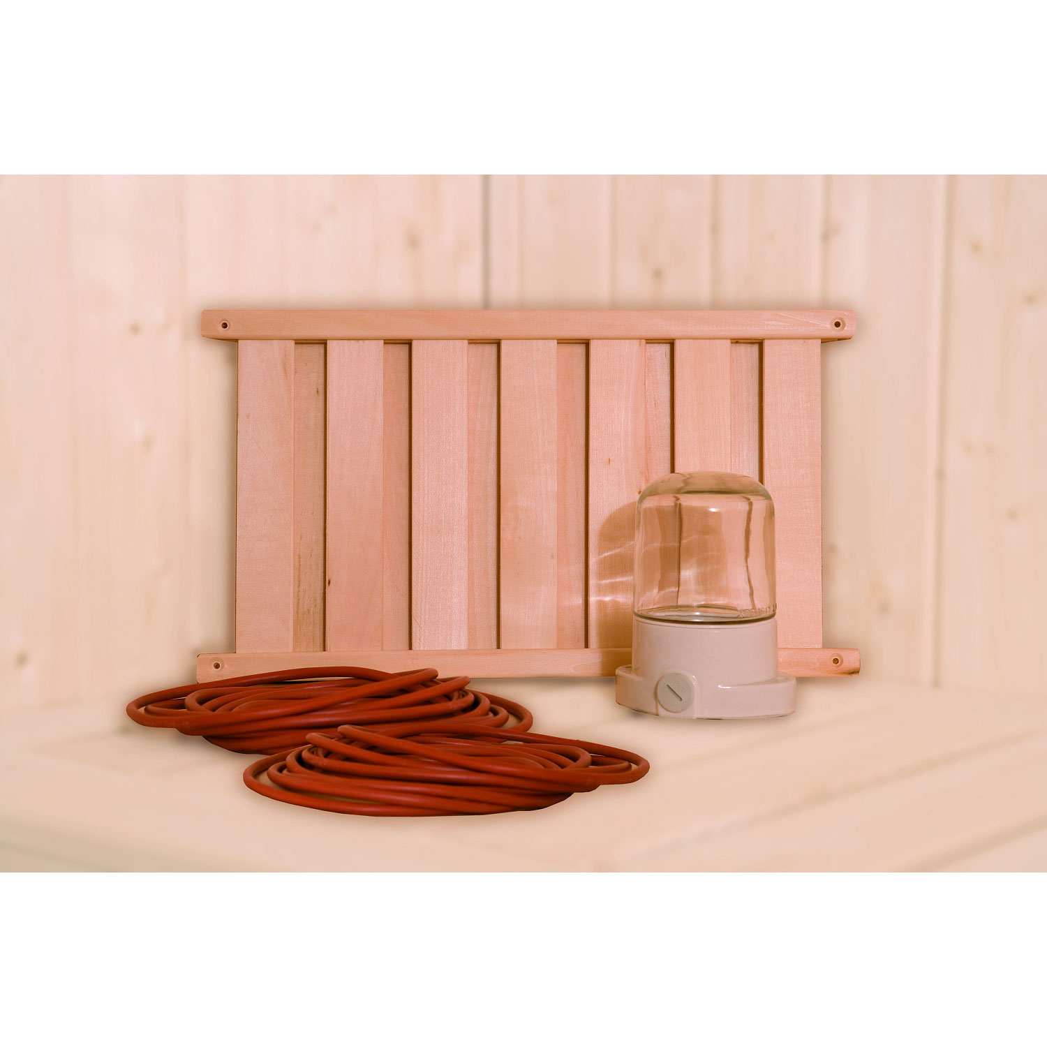 Das Sparset wird durch ein umfangreiches Zubehörpaket vervollständigt. Dieses beinhaltet ein 5,4 kW Saunaofen mit integrierter Steuerung, ein Silikonkabel für den Ofen-Anschluss sowie ein Spezial-Saunaleuchten-Set.